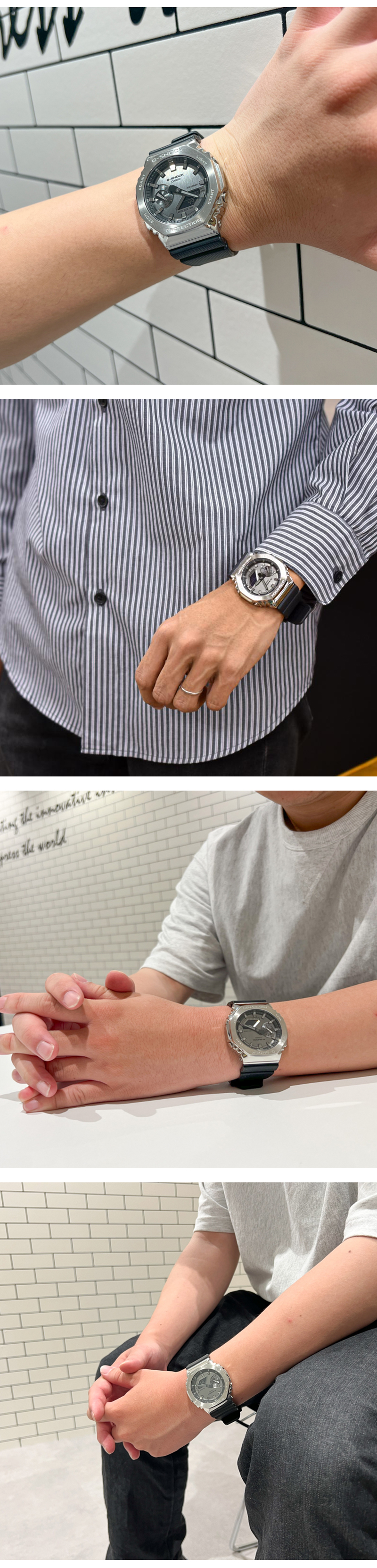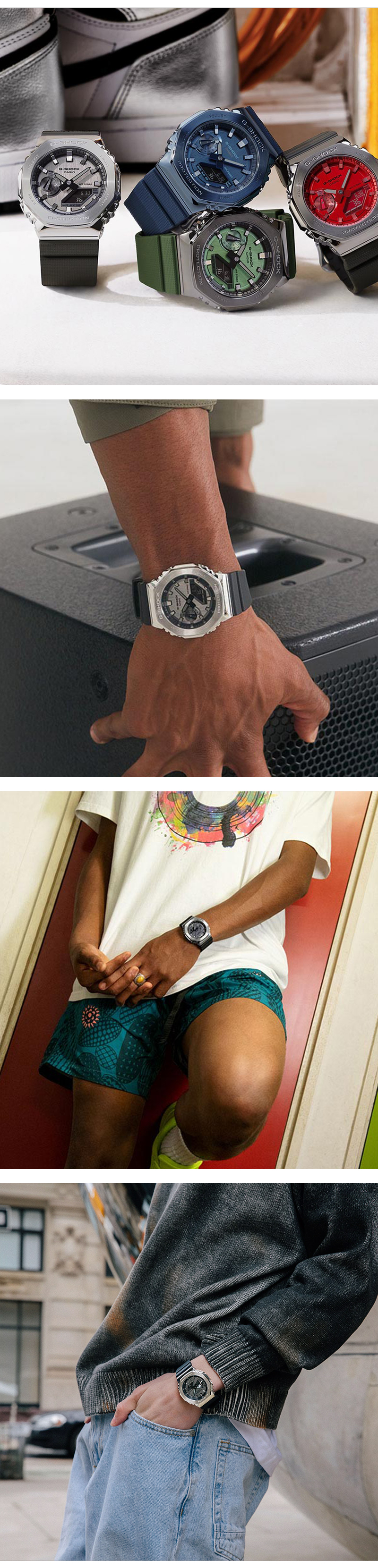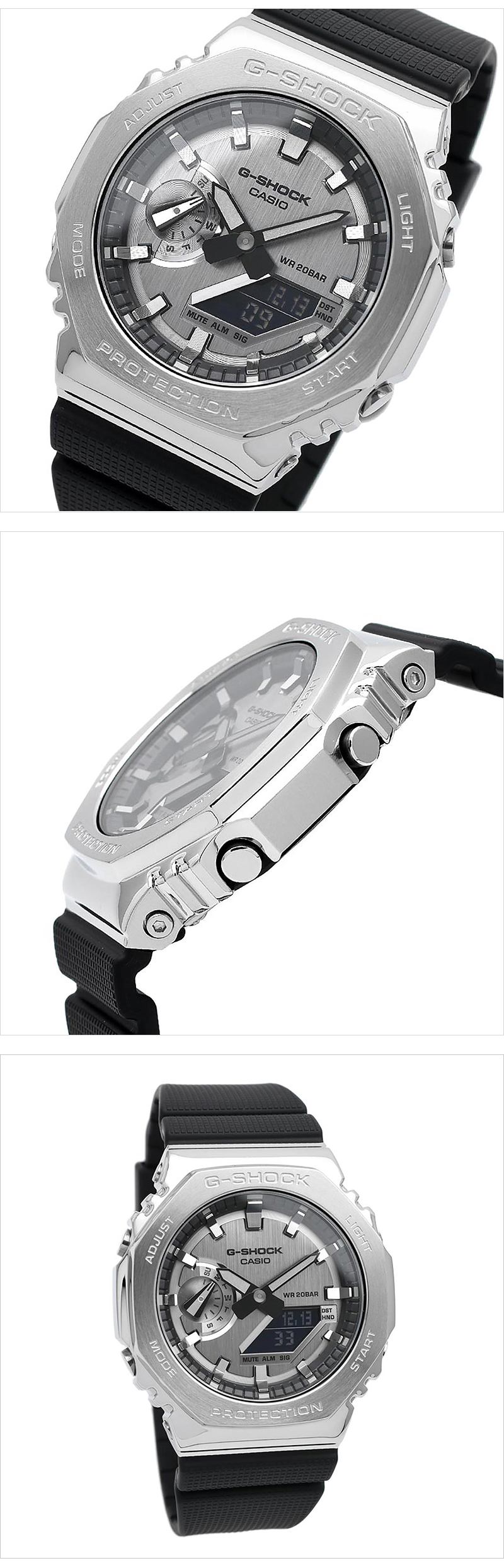 1983年の誕生以来、タフネスを追求し進化を続けるG-SHOCKの初代モデル“DW-5000C”にも採用された“八角形フォルム”を継承するGA-2100シリーズから、メタル素材を採用したモデルです。ベゼルカバー部分に硬質なステンレス素材を採用。ステンレスのベゼルに、円周状のヘアライン仕上げを施し、シックなデザインとなっています。また、文字板に蒸着処理を施し、GA-2100らしいシンプルデザインをシャープかつスタイリッシュに引き上げました。更にバンドには徐々に変化するチェッカーパターンのテクスチャをさりげなく入れ、カジュアルな印象の樹脂バンドに上質感をプラスしています。 GM21001AJF