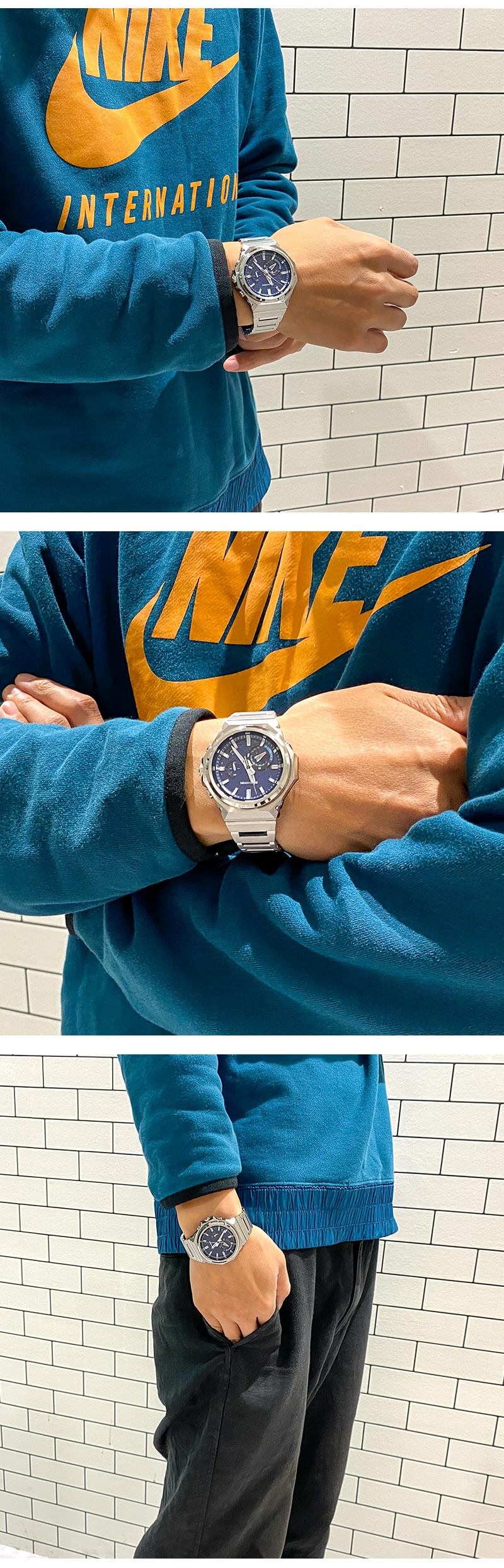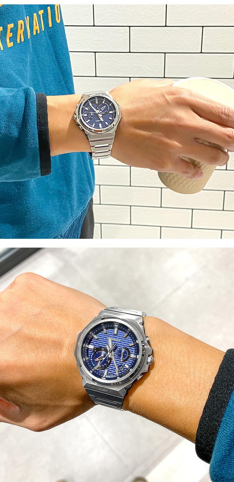 G-SHOCKが長年培ってきたタフネス構造と、機能美に根ざしたデザイン思考を受け継ぎ、それを研ぎ澄まされたミニマルな表現で再構築した新たなスタイル、SLEEK STYLE(スリークスタイル )のモデルです。ロゴを排してクリーンな印象に仕上げたベゼルは、縦のヘアライン、円系のヘアライン、ミラー 仕上げの3種で磨き分けられ、光の角度で表情を変え、豊かな質感を演出します。GST-B1000のために開発されたステンレススチール製のバンドには、ヘアライン仕上げとミラー仕上げを施しています。新開発の三つ折れ式中留は、端正なデザインとホールドが魅力。控えめな佇まいが、腕元に上質な空気を纏います。G-SHOCK初号機“DW-5000C”から継承したベゼルデザインやレンガパターンが、ドレッシーな装いの中にスポーティさを加えています。GST-B1000D-1AJFには、同じく初号機から継承した、挑戦する情熱を意味するレッド、防水性を表すブルー、ショックレジスタントを意味するイエローをアクセントカラーに採用。構造面では、メタルベゼルが外部からの衝撃をガードし、カーボンファイバー強化樹脂製のケースがモジュールを保護しています。また、メタルバンドの接続部分にはウレタン樹脂製の緩衝パーツを採用することで、バンド接合部に加わる衝撃を吸収し、メタルバンドの連結強度を高めています。さらに、ガラス接着方式や小型モジュールを採用することで、耐衝撃構造を実現しつつ、厚みや重量を削減。快適な着け心地と実用性を両立しています。コンパクトなサイズ感とミニマルなデザインは、ビジネスからカジュアル、アウトドアまで自在に対応。一つの時計で多くの瞬間に対応できる「オールラウンド・タイムピース」として活躍します。※ケースの主な樹脂パーツにバイオマスプラスチックを使用。原料に再生可能な有機資源を使用し、環境負荷低減への貢献が期待されています。