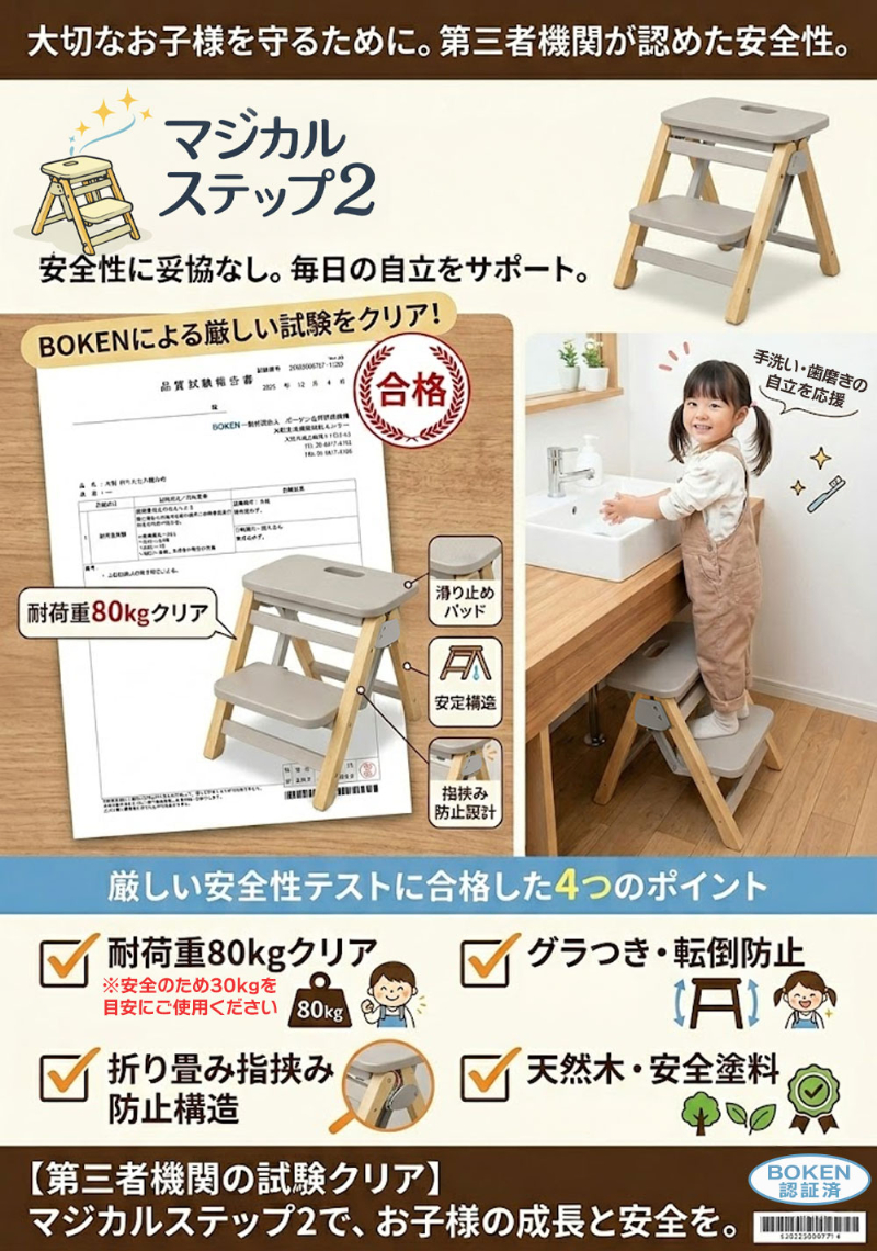 第三者機関にて耐荷重80kg相当の荷重試験を実施しており、日常使いでも安心してお使いいただけます。