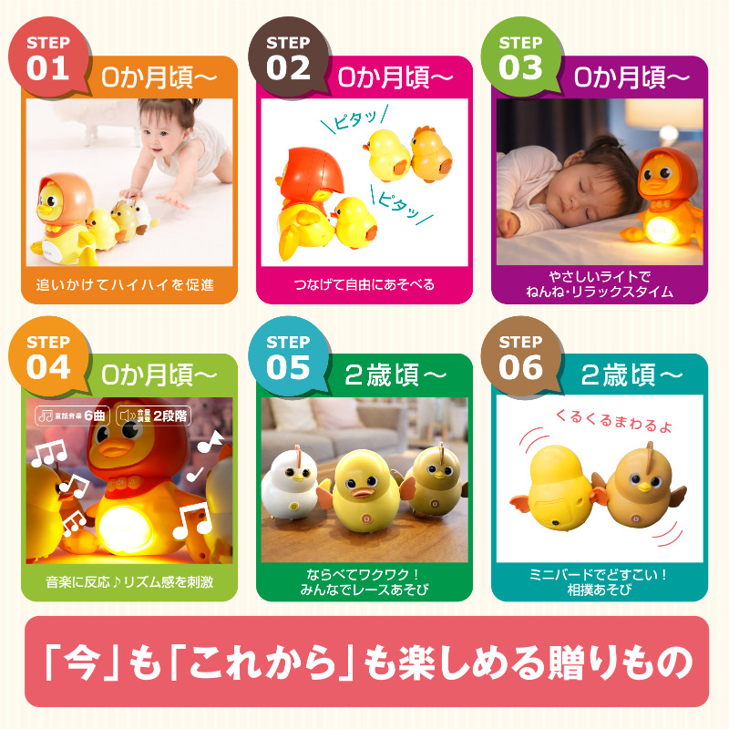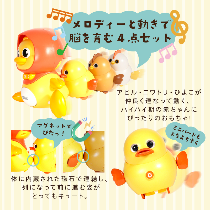 アヒル・ニワトリ・ひよこが仲良く連なって動く、ハイハイ期の赤ちゃんにぴったりのおもちゃです。