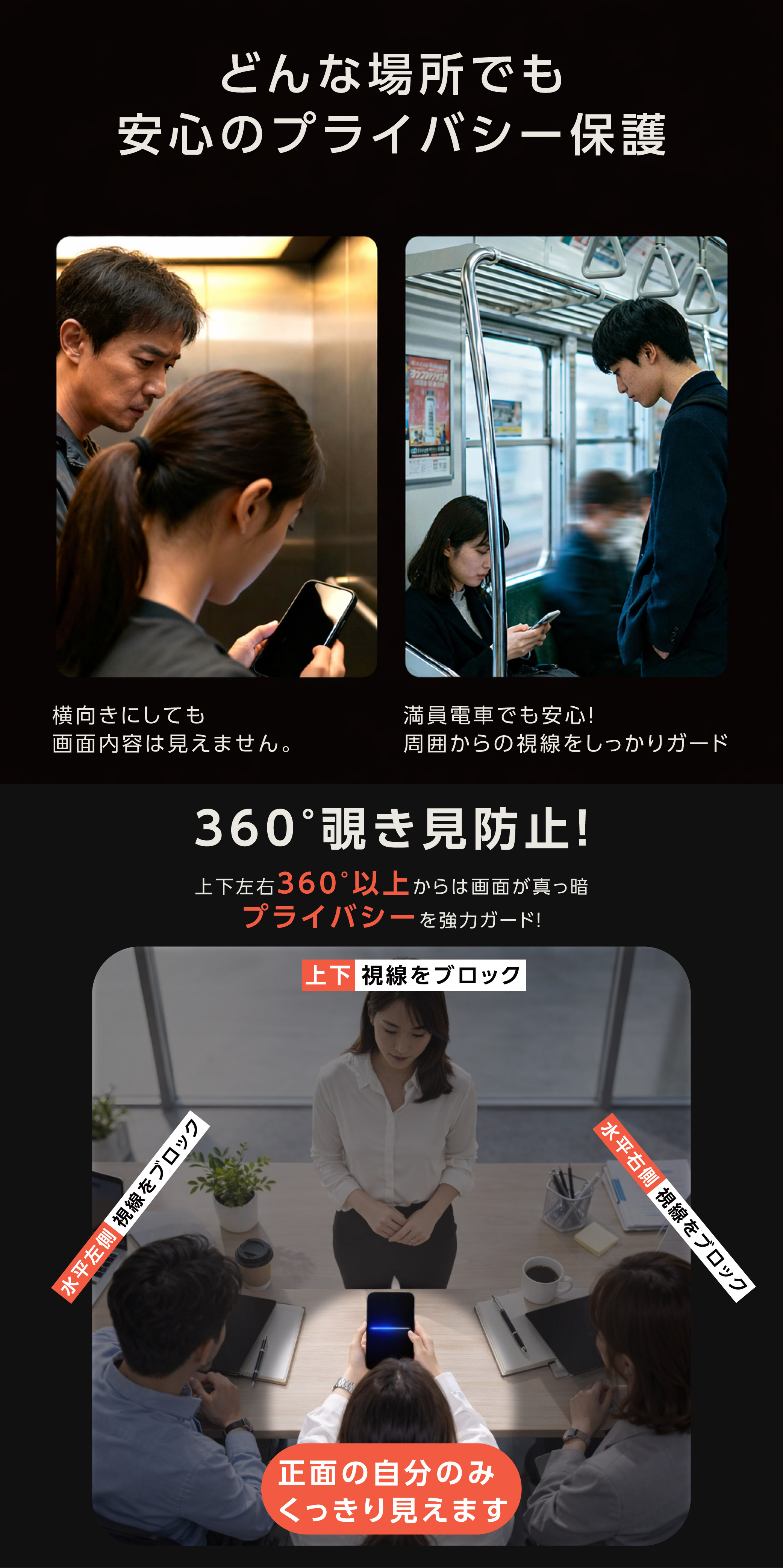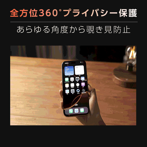 屋外、電車やバスなど人が大勢いる中でも覗き見防止加工により、他人に表示中の畫面を見られる心配がありません。