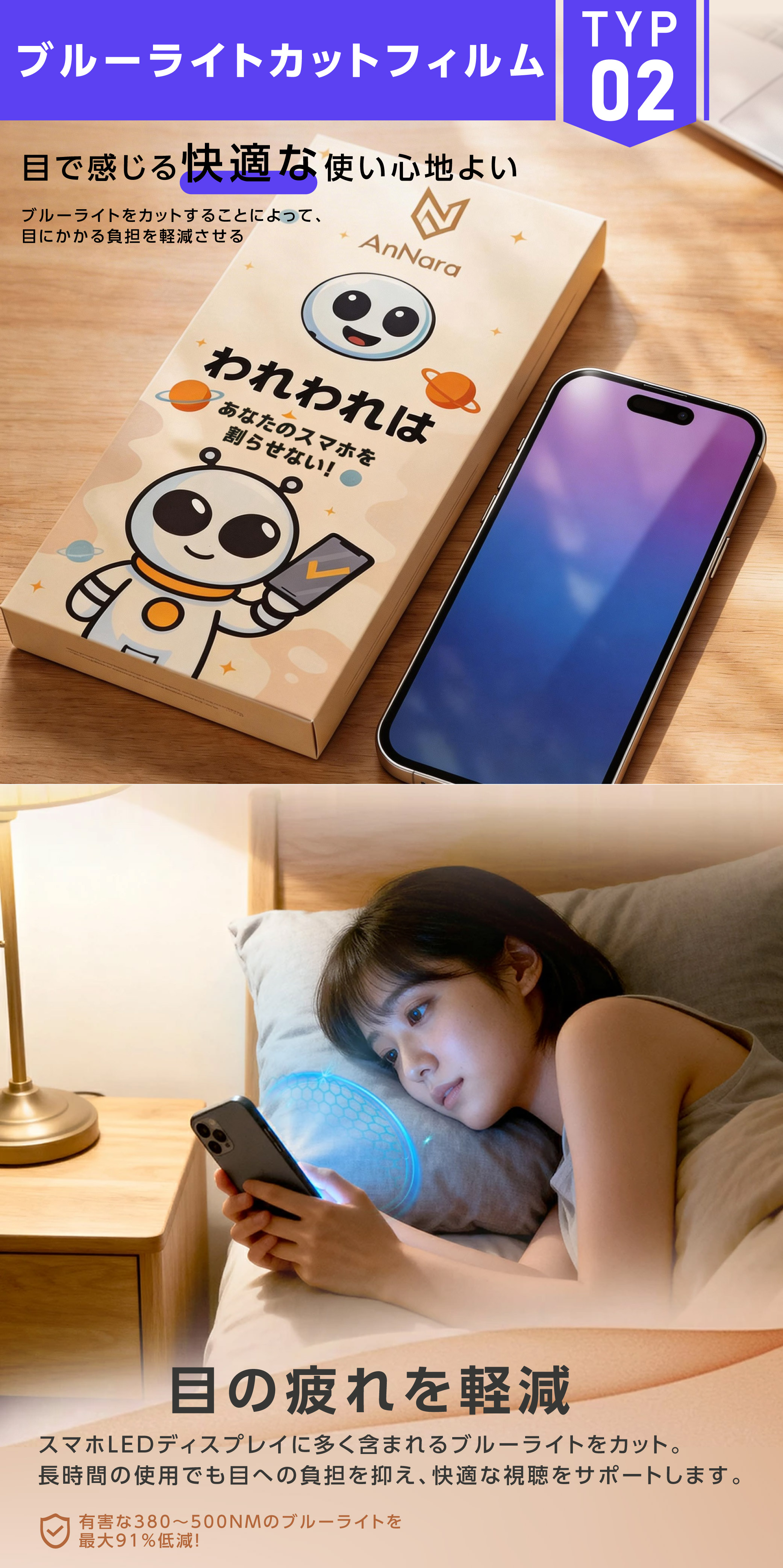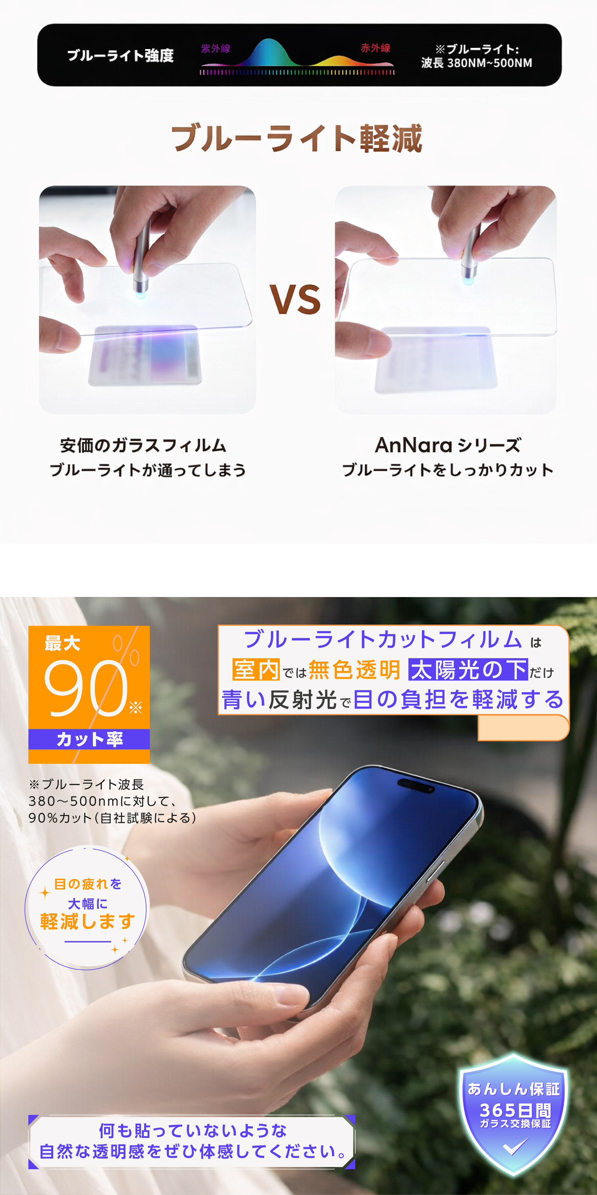 目の水晶体で吸収されにくく、網膜を傷つける恐れがある、ブルーライトを大幅カット。