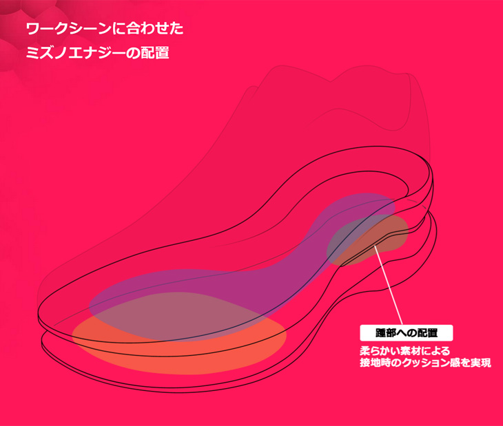 ミッドソール全面にMIZUNO ENERGYを搭載し、優れたクッション性と反発性を実現。