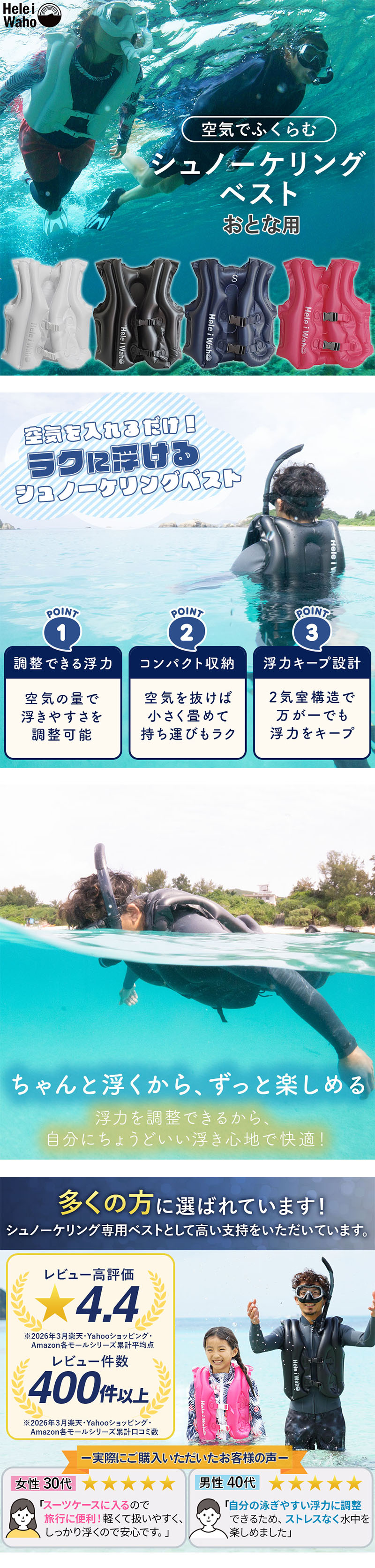 | ■商品名 HeleiWaho 大人用 シュノーケリングベスト(空気式) ■商品説明 着るだけで、ラクに浮ける。ちゃんと浮くから、ずっと楽しめる! 浮き輪のように膨らませて使う、空気式のシュノーケリングベスト。水面で無理なく浮けるので、力を抜いてリラックスしながらシュノーケリングを楽しめます。 海や川、プールなどの水辺は、思っている以上に体力を使います。このベストを着ることで、疲れにくく、長時間でも快適に遊べます。 空気式だから、使わないときはコンパクトに収納可能。スーツケースにも収まりやすく、旅行や持ち運びにも便利です。家族分をまとめて持ち運ぶ際にも、かさばりにくいのが魅力です。 ■特徴 ・空気で膨らむ軽量タイプ 浮き輪のように膨らませるだけで簡単に使えます ・コンパクト収納 空気を抜けば小さく畳めて、旅行や持ち運びもラク ・浮力調整が可能 空気量を調整することで、浮きすぎを防ぎ、自分に合った浮き心地に調整できます ・水面でラクに浮ける 無理な力を使わず、リラックスした状態で浮ける ・2気室構造 空気室を分けることで、万が一の際も浮力を維持しやすい設計 ■使用シーン ・海水浴 ・シュノーケリング ・プール ・川遊び ・旅行・リゾート ■こんな方におすすめ ・旅行用にコンパクトなアイテムを探している方 ・浮き輪よりも動きやすい装備を探している方 ・長時間のシュノーケリングで疲れたくない方 ・家族分まとめて持ち運びたい方 ■仕様 ・素材:PVC(塩化ビニール) ・サイズ:大人用 ■重要事項 ※本製品は救命胴衣(ライフジャケット)ではありません ※法定備品としては使用できません |