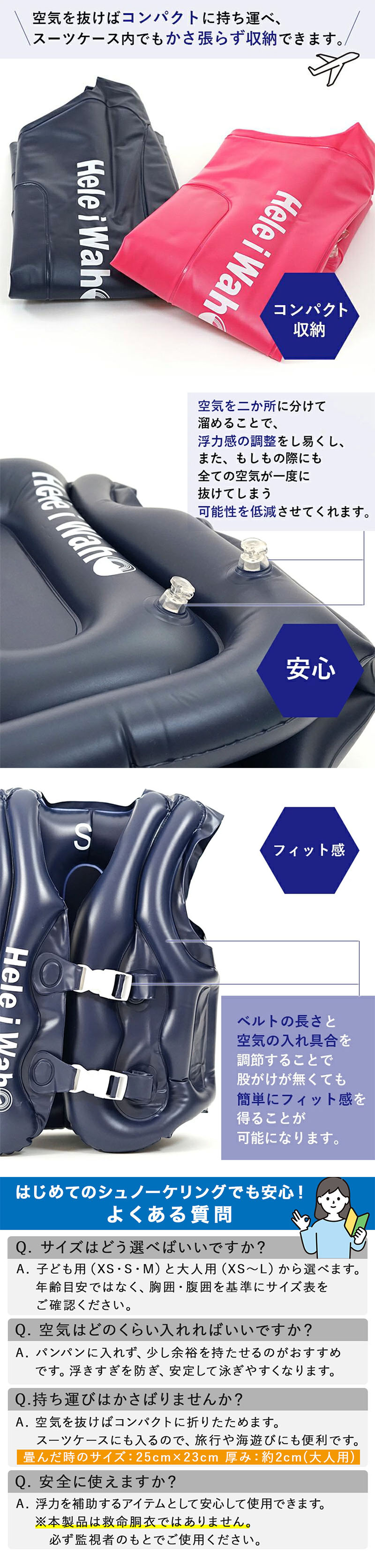 | Q. 空気はどのくらい入れればいいですか? A. パンパンに入れず、少し余裕を持たせるのがおすすめです。浮きすぎを防ぎ、安定して使えます。 Q. 持ち運びはかさばりませんか? A. 空気を抜けばコンパクトに折りたためるので、スーツケースにも収納しやすい設計です。 Q. 大人でもしっかり使えますか? A. 大人用サイズを用意しており、体格に合わせて選べます。ベルトと空気量でフィット感も調整できます。 Q. 安全に使えますか? A. 浮力を補助するアイテムとして使用できますが、本製品は救命胴衣ではありません。安全な場所でご使用ください。 |