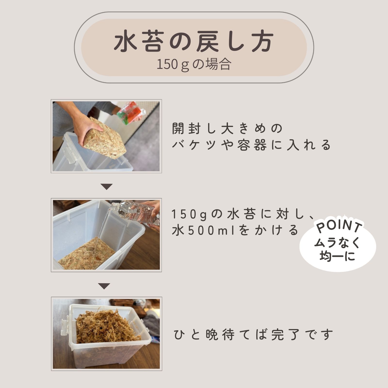 そこへ、水苔の量に対して約半分程度の水を加え、袋の口をしっかり閉じて数分置きます。