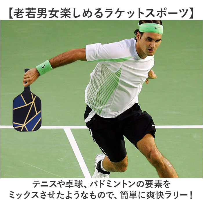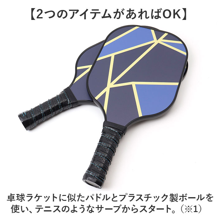 | 【どなたでも手軽に運動を楽しめる】 ・世代問わず交流できて、レジャーシーンなどでも遊べる!アメリカ生まれの「ピックルボール」。 【老若男女楽しめるラケットスポーツ】 ・テニスや卓球、バドミントンの要素をミックスさせたようなもので、簡単に爽快ラリー! 【2つのアイテムがあればOK】 ・卓球ラケットに似たパドルとプラスチック製ボールを使い、テニスのようなサーブからスタート。 (※1)通常はバドミントンと同じ大きさのコートで打ち合うスポーツです。 【軽やかかつグリップ力抜群】 ・しっかり握りやすく、滑りにくい持ち手◎軽量なつくりで打ちやすいのもポイント! 【屋内外問わず遊べるのが嬉しい】 ・穴の数が少ないインドア用と、穴の数が多いアウトドア用の2種類のボールが付属。 (※2)アウトドア用は穴のサイズが小さく、風の影響を受けにくい設計です。 【持ち運びに便利なバッグ付き】 ・ラケットとボールをまとめて収納。手持ちも肩掛けもでき、外側にはポケットを配置。 (※3)競技用ではなく、ご家庭で楽しむための商品となります。 |