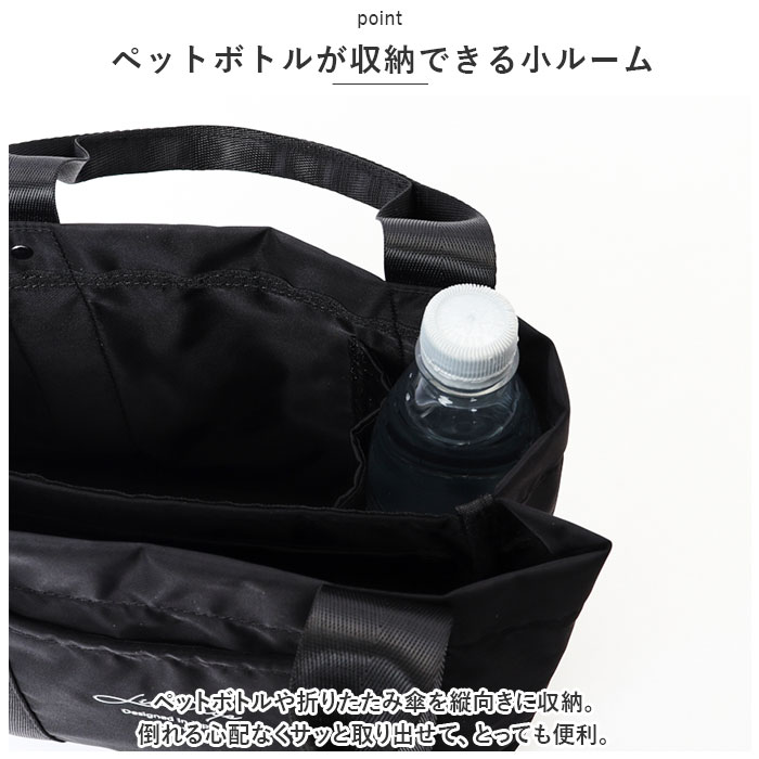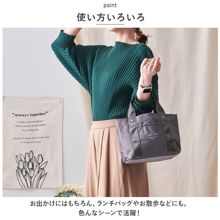| ・デイリー使いにぴったり。手軽に持ち出せて、整理整頓もラクラク!ナイロンタイプの「仕切り付きミニトートバッグ」が新登場。 【大人な仕上がり】 ・サラッとした質感のナイロン素材を使用。上品な程よい光沢感があり、コーデを選ばず使える万能アイテム。 【軽やかな使い心地】 ・お出かけのマストアイテムが、すっきり収まるミニトート。体にかかる負担を軽減する軽量設計で、長時間の移動もストレスフリー。 【オープン開口】 ・開口部はガバっと開くオープンタイプ。中身が見やすく、取り出しもスムーズ。 【仕切り付きの3ルーム仕様】 ・内側は3ルームに分かれており、急いでいる時も中身がひと目で確認できて誰でも収納上手に♪仕切りは荷物の大きさに合わせて調節できる可動式。 【B5サイズ対応の大ルーム】 ・B5サイズのノートが横向きにすっぽり。長財布や本も収納OK。 【使い勝手の良い中ルーム】 ・ミニポーチやサニタリーグッズ、コンパクトなお弁当箱などが収まるサイズ感。 【ペットボトルが収納できる小ルーム】 ・ペットボトルや折りたたみ傘を縦向きに収納。倒れる心配なくサッと取り出せて、とっても便利。 【小物が迷子になりにくい!】 ・内側と外側に1つずつポケットを装備!移動中も、小物が取り出しやすいつくり。 【使い方いろいろ】 ・お出かけにはもちろん、ランチバッグやお散歩などにも。色んなシーンで活躍! 【ちょっとの雨なら大丈夫】 ・両面に水滴や汚れを弾く撥水加工済みで、お手入れも拭き取るだけ。(※完全防水ではありません。) 【お気に入りをチョイス】 ・コーデに馴染みやすい、落ち着きのあるカラーをラインナップ。年代問わず持ちやすいデザインも魅力。 【ポケット仕様】 ・内側:オープンポケット×1 ・前面:オープンポケット×1 |