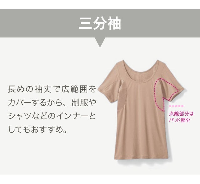 ・三分袖で二の腕部分まで広範囲に汗をカバー!制服の下にも活躍