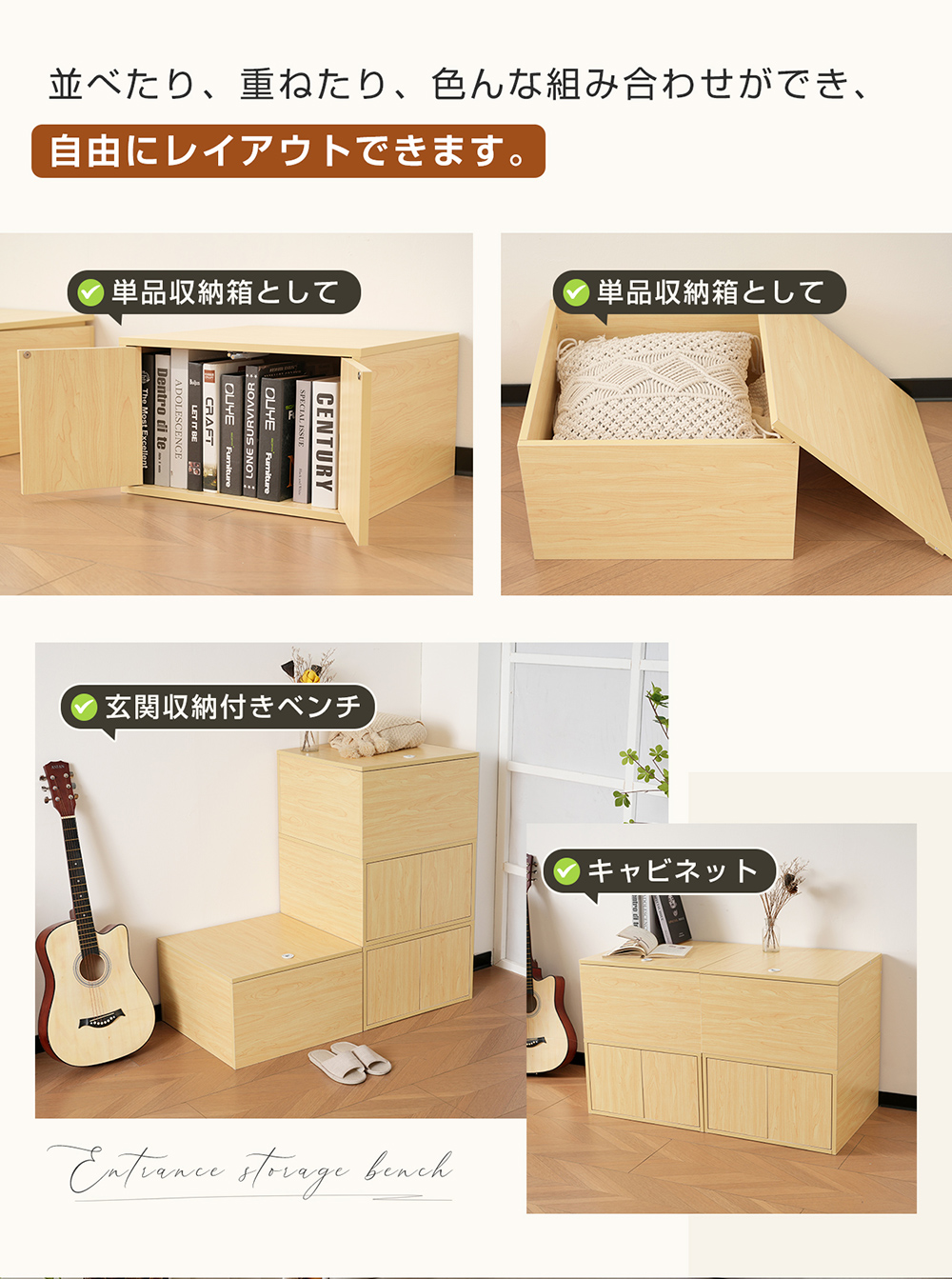 選べる3タイプ:独立フタボックス/横両開きボックス(プッシュオープン扉フタ)/上開きボックス;さまざまなサイズに組み合わせることができます限られたスペースを有効活用。並べたり、重ねたり、色んな組み合わせができ、自由にレイアウトできます。