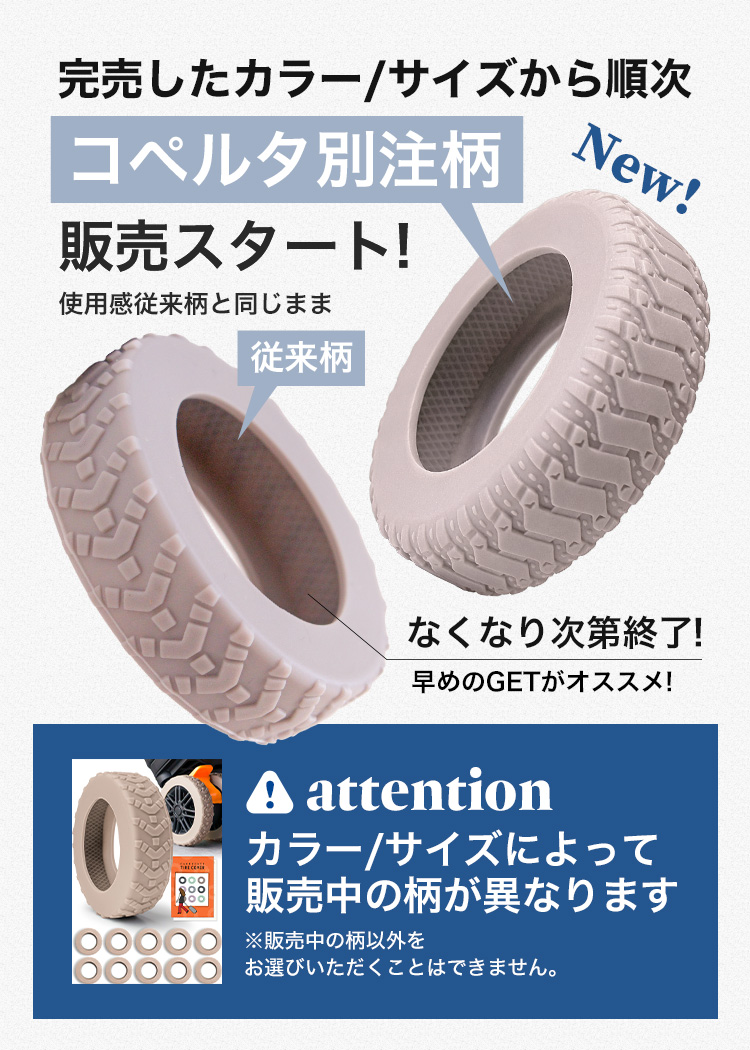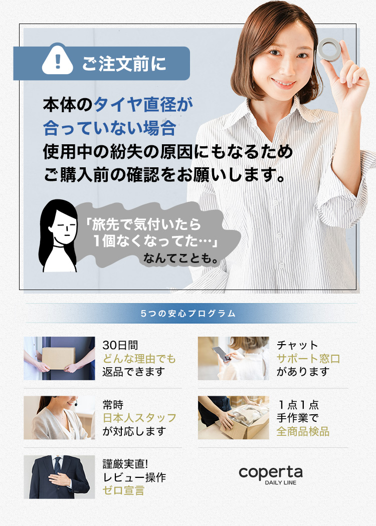 | キャスターカバーの内側には特殊な滑り止め加工が施されており、タイヤにしっかりと固定されるため移動中もズレにくく、安心して使用できます。これにより、タイヤカバーがずれることによる摩耗や損傷を防ぎ、キャリーケースの寿命を延ばすことが可能です。安全で快適な移動を実現するための工夫が詰まっています。 | 【幅広いサイズに対応】 |