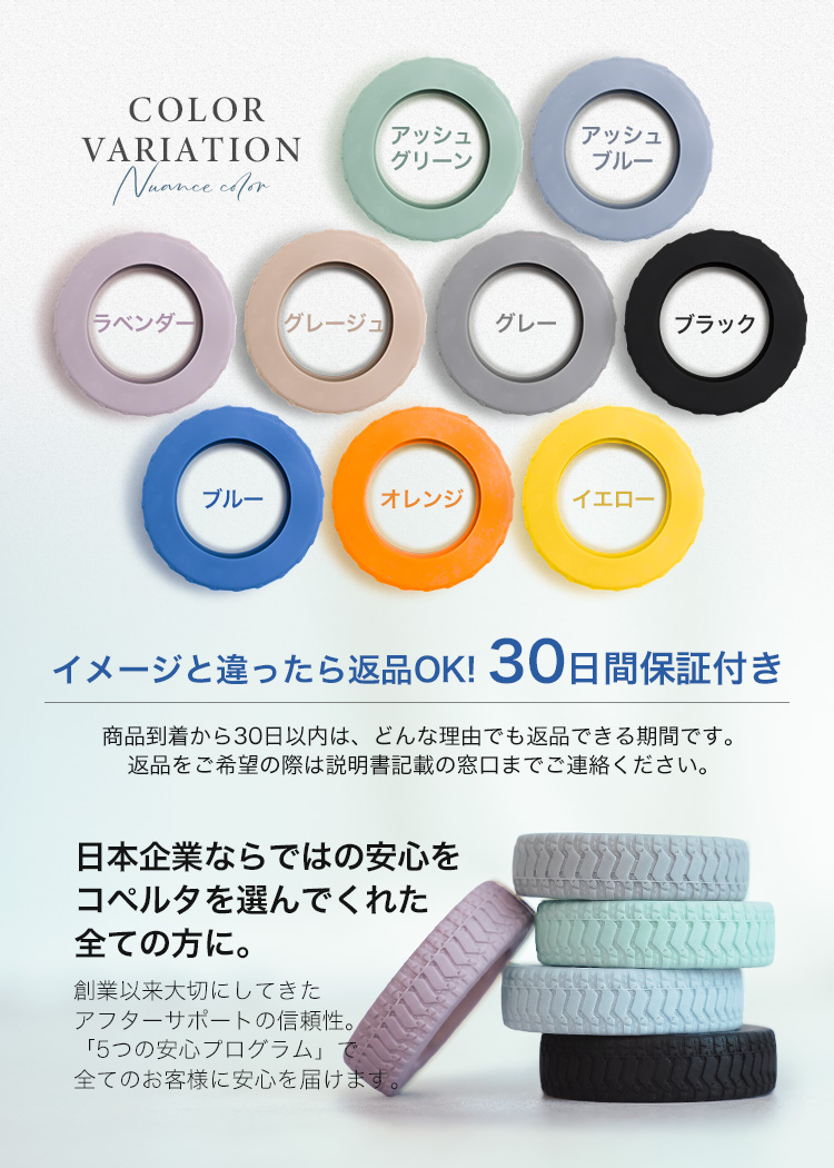 | コペルタのスーツケース用キャスターカバーは、耐久性に優れた高品質シリコン素材を使用しているため、長期にわたってご利用いただけます。旅先での様々な路面や頻繁な移動にも対応できる頑丈な設計で、キャリーケースのタイヤをしっかり保護します。ビジネスでの出張や旅行が多い方にとって、頻繁な使用でも劣化しにくく信頼できるアイテムです。 | 【防水・防汚加工】 |