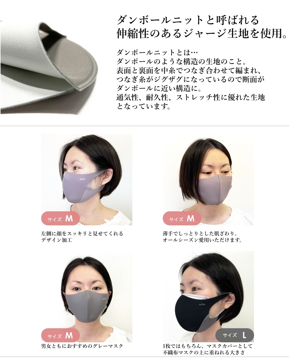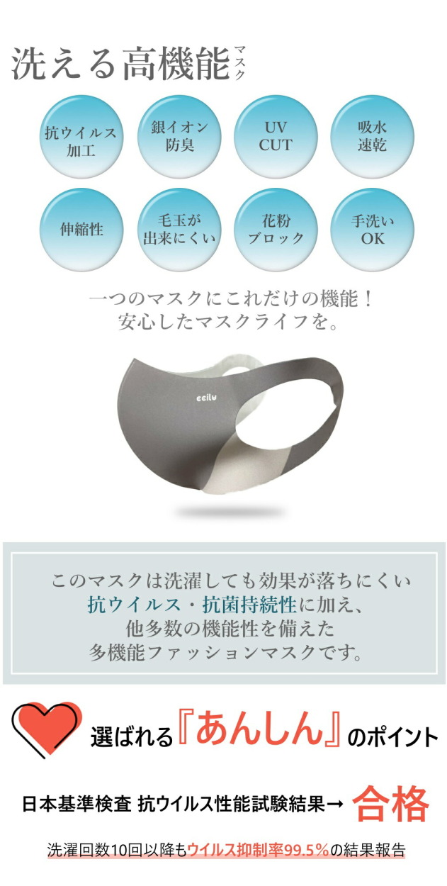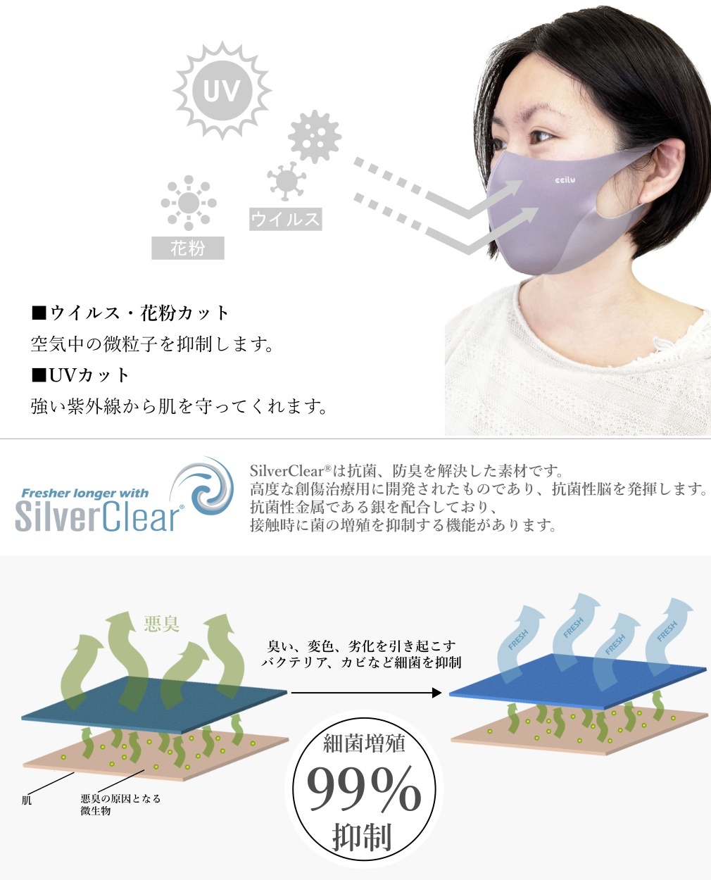 抗ウィルス加工、銀イオン防臭、UVCUT、吸水速乾、伸縮性を施したcciluマスク