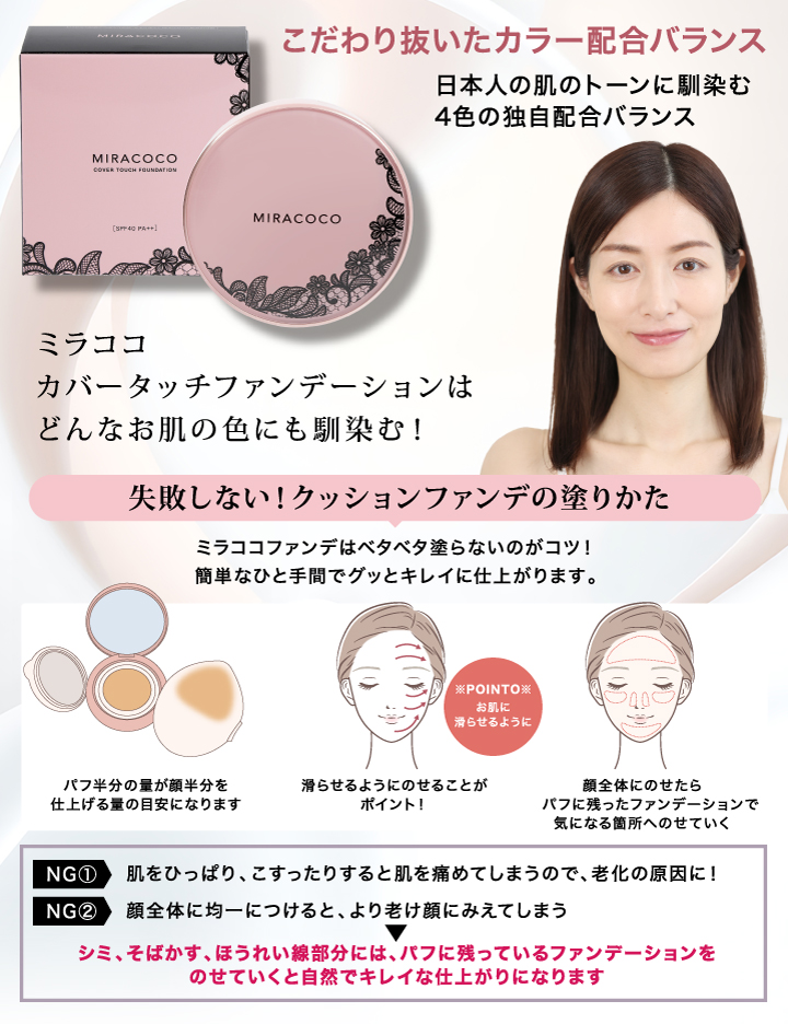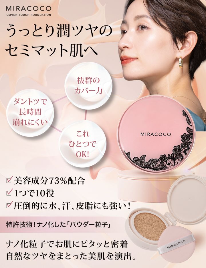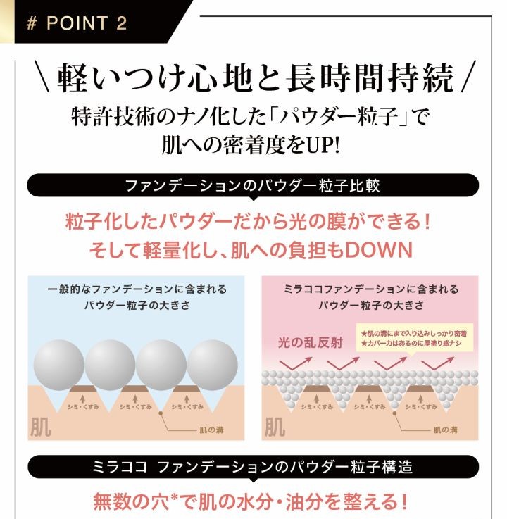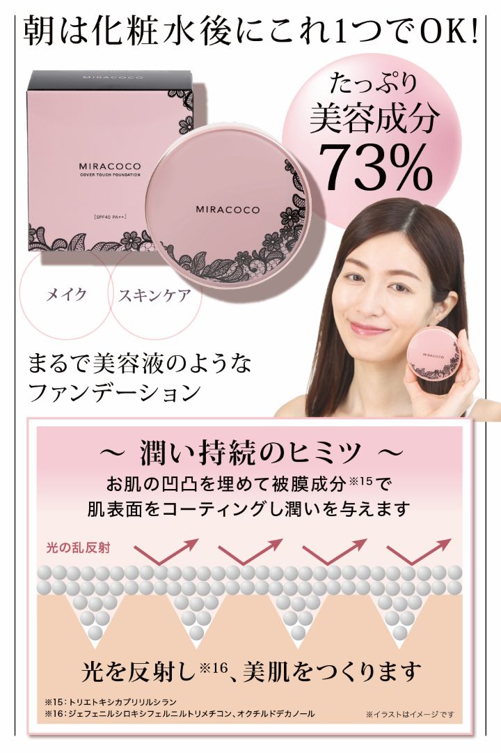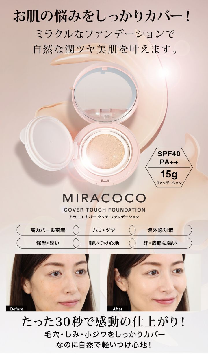 一般的なファンデーションは、なかなかお肌に密着せずにすぐに崩れてしまうことも。理由は、粒子の粒が大きく肌への密着度が低いので、ファンデーションがお肌から離れてしまうのです。この「MIRACOCO ミラココカバータッチファンデーション」は、独自の技術「密着シールドテクノロジー」 で、ファンデーションの粒子を小さく小さく、ミクロ化する技術で、お肌にピタッと密着!ミクロの粒子がお肌に吸い付くので、長時間崩れにくく、気になる所は全部カバーしてくれます!薄づきなのにしっかりカバー。ファンデーションなのに、美容液がたっぷり配合されているので、付けている間ずーっと、お肌に優しく潤いを与え続けてくれます。