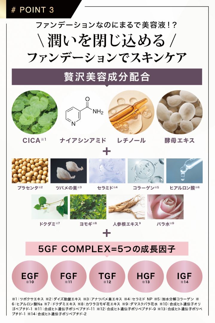 ファンデーションなのに、美容液がたっぷり配合されているので、付けている間ずーっと、お肌に優しく潤いを与え続けてくれます。皮膚を整える成分、保湿成分、CICA・ナイアシンアミド・レチノール・酵母エキス・プラセンタ・ツバメの巣・セラミド・コラーゲン ・ヒアルロン酸・ドクダミ・ヨモギ・人参根エキス・バラ水、配合。メイク中も肌をいたわりたい、そんなあなたにおすすめです。「MIRACOCO ミラココカバータッチファンデーション」の更に凄い秘密は、なんと5つの成長因子「5G COMPLEX」1.EGF 2.FGF 3.TGF 4.HGF 5.IGF、が配合されています!肌ダメージの集中ケアしながら、角質層のキメを整え、肌本来の美しさを引き出します。成長因子によって、肌本来の働きをしっかりサポートします。