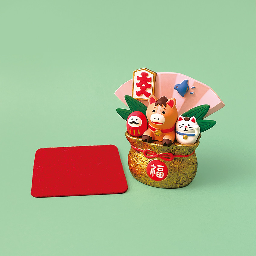 *宝袋から馬と縁起物がひょっこりにっこり登場。めでたさがあふれ出す、進化系「瓢箪から駒」