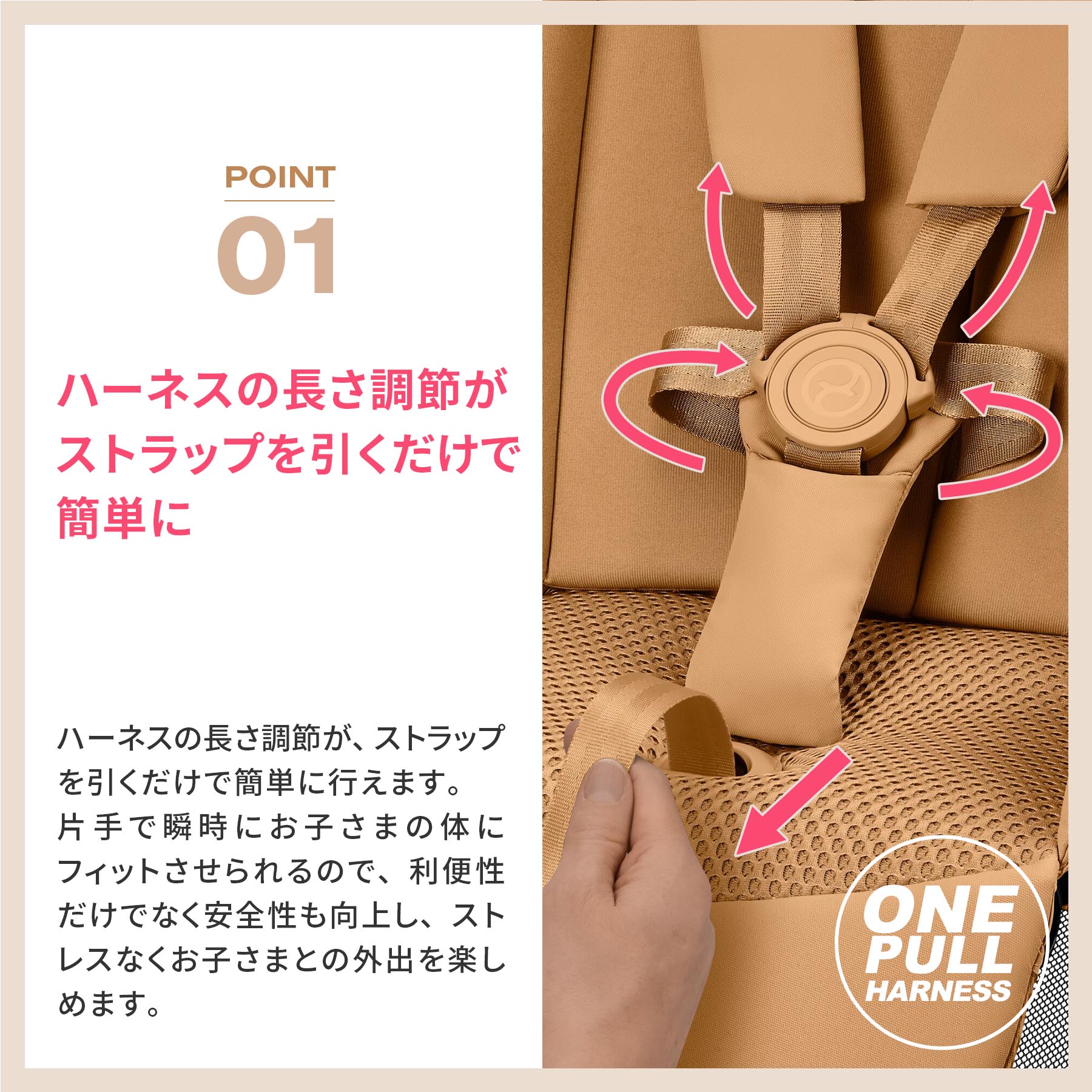 ・ワンプルハーネス…ストラップを引くだけで簡単調節。安全性・利便性向上。