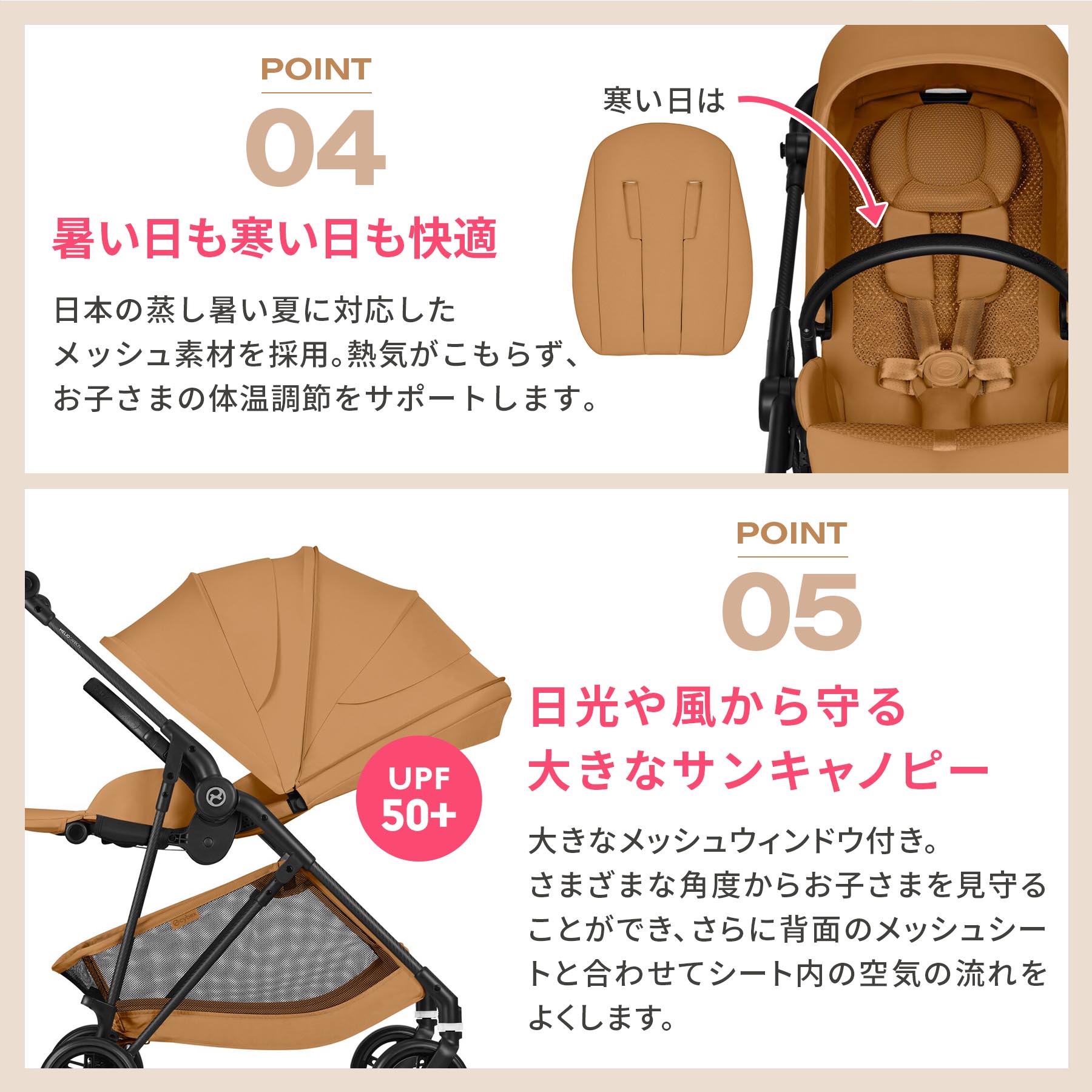 ・XXLサイズのUPF50+サンキャノピーで紫外線をカット。