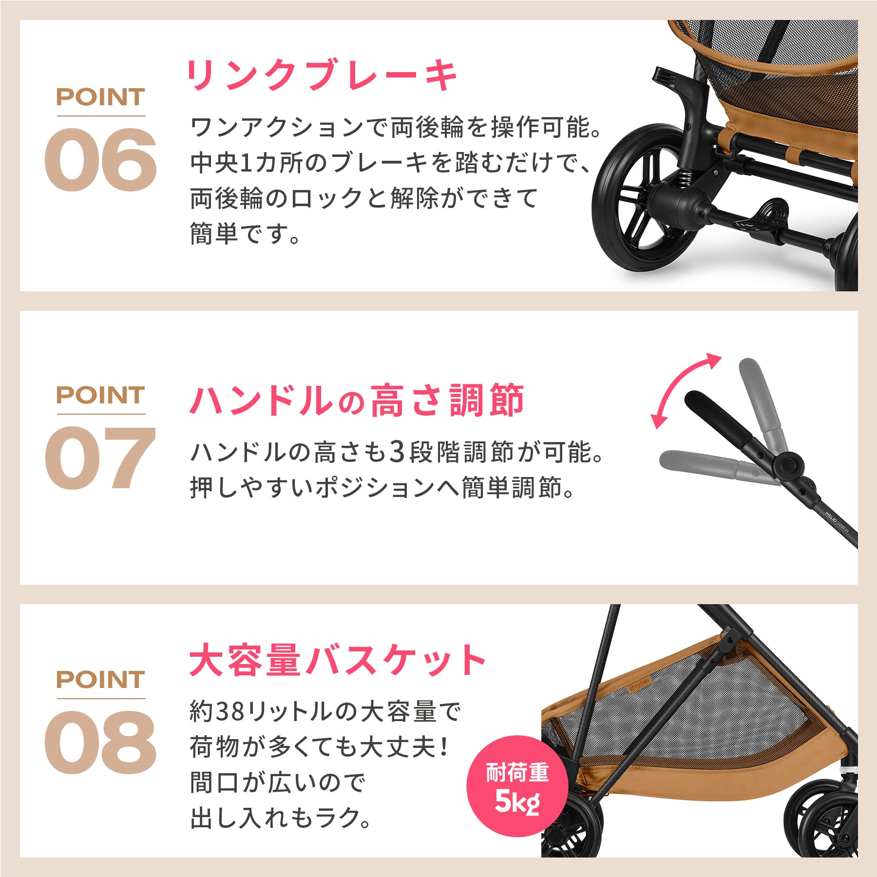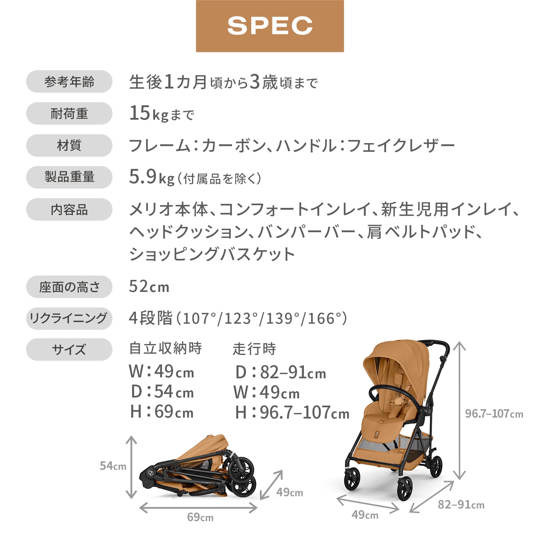 ・重量5.9kg(付属品含まず)と軽いカーボンフレームのストローラー。