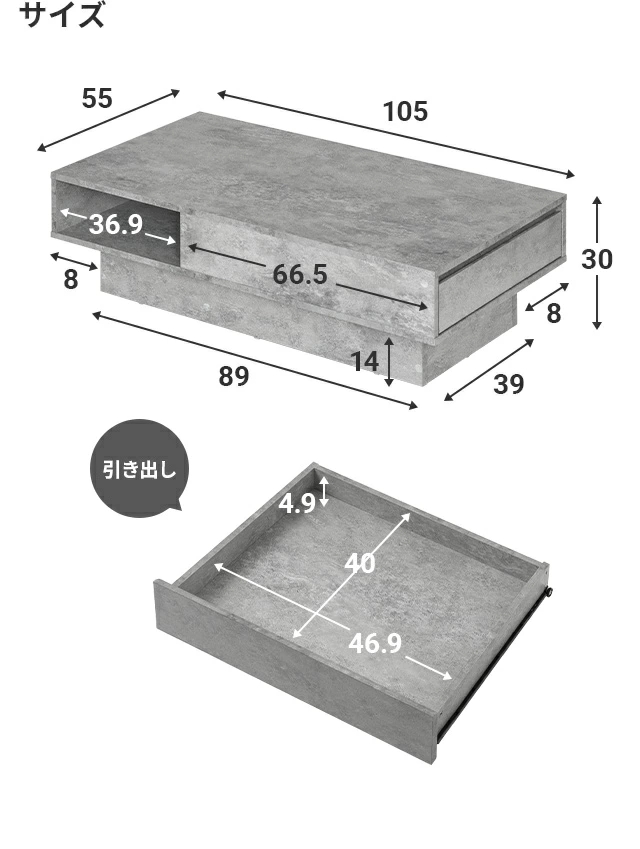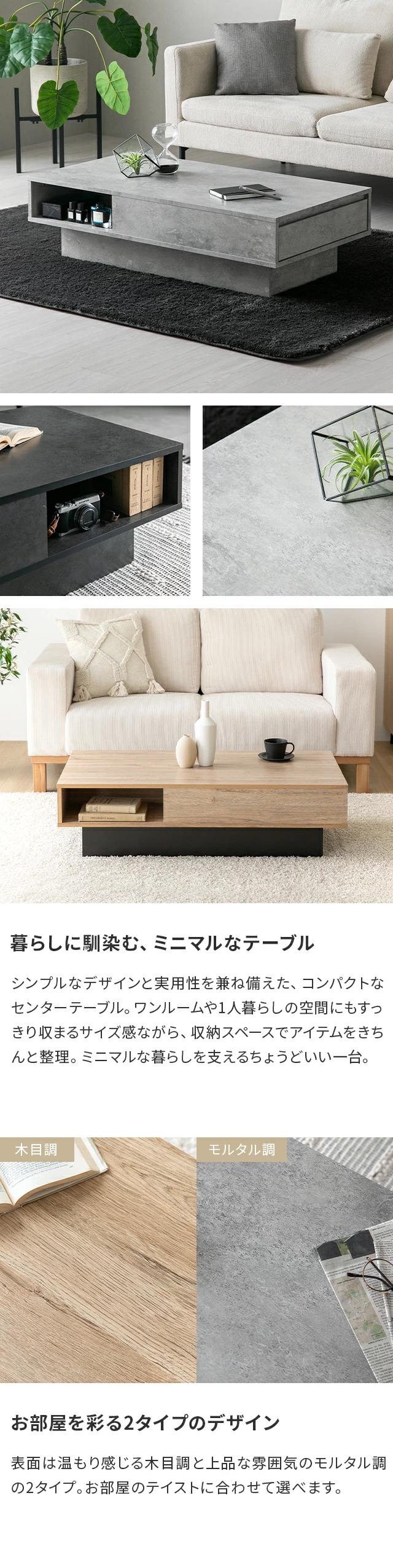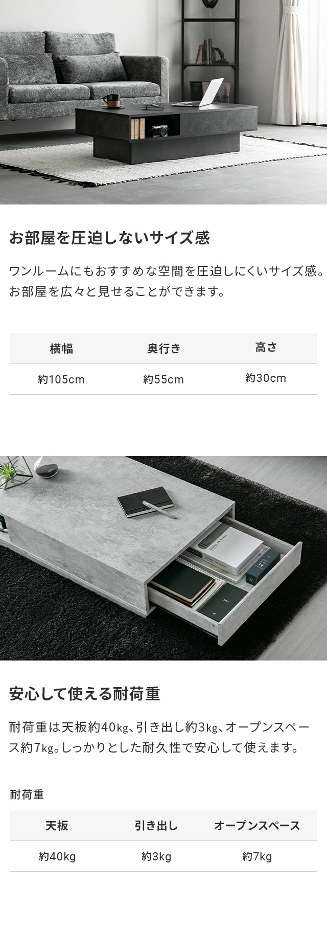 検索キーワード: センターテーブル テーブル ローテーブル 引き出し 幅105cm 奥行55cm 収納 収納付き モルタル調 長方形 収納テーブル リビングテーブル 机 デスク 一人暮らし 引出し付き 作業台 デスクワーク テレワーク 北欧 新生活