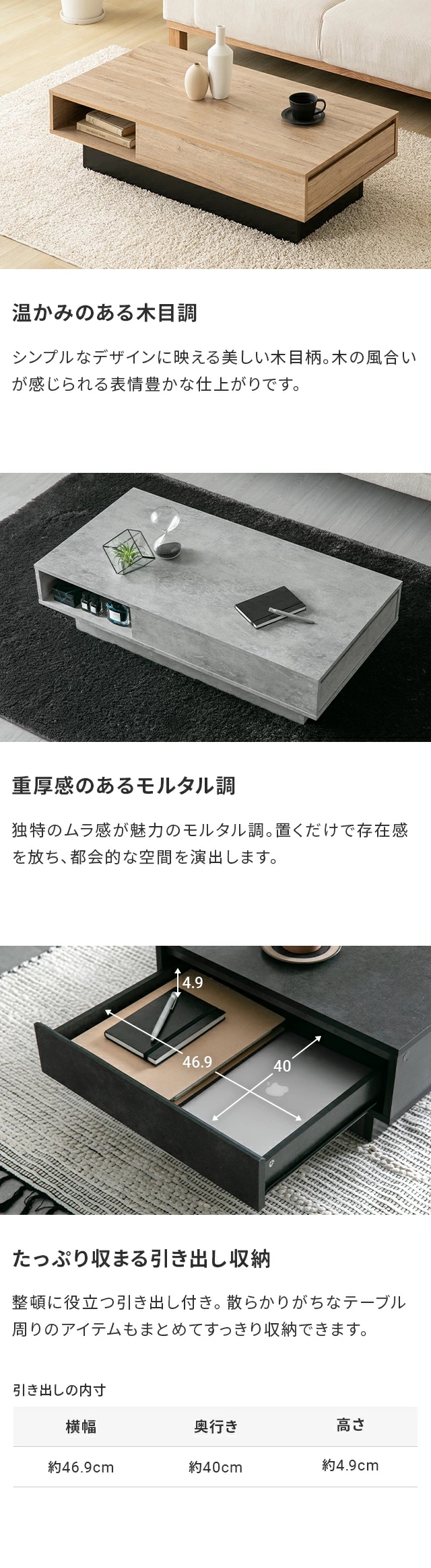 テーブル センターテーブル 引き出し 収納 モルタル調 机 ローテーブル リビングテーブル デスク 収納テーブル 長方形 北欧