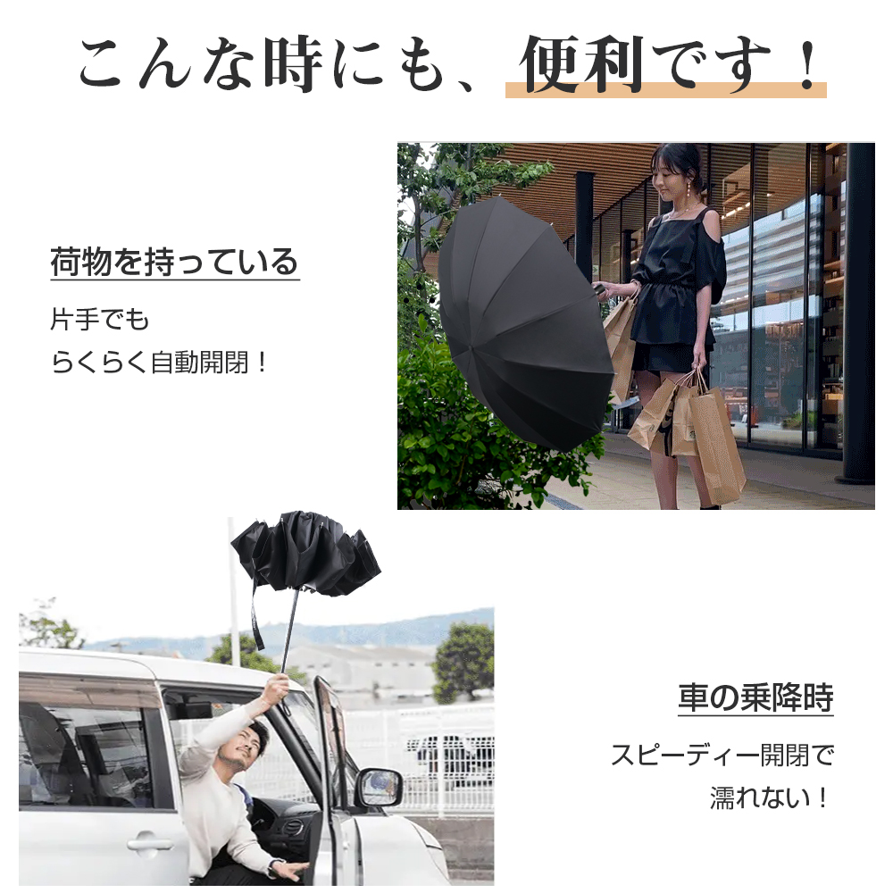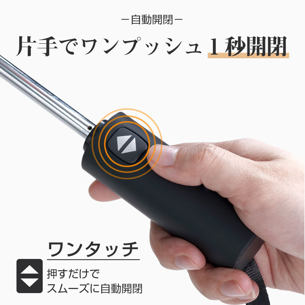 自動開閉機能が備わり、片手でワンタッチ操作できる折りたたみ傘です。便利な自動開閉式の折り畳み傘です。