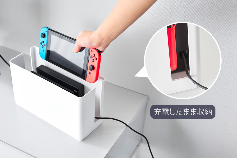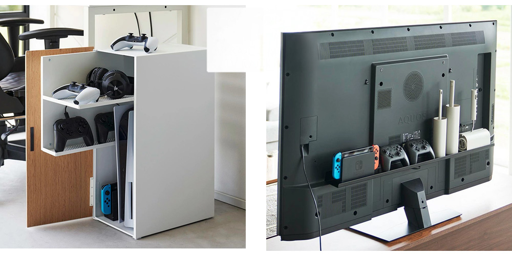 リビングなどで雑然としがちな小型ゲーム機やコントローラーを、外から見えないように隠して収納できます。