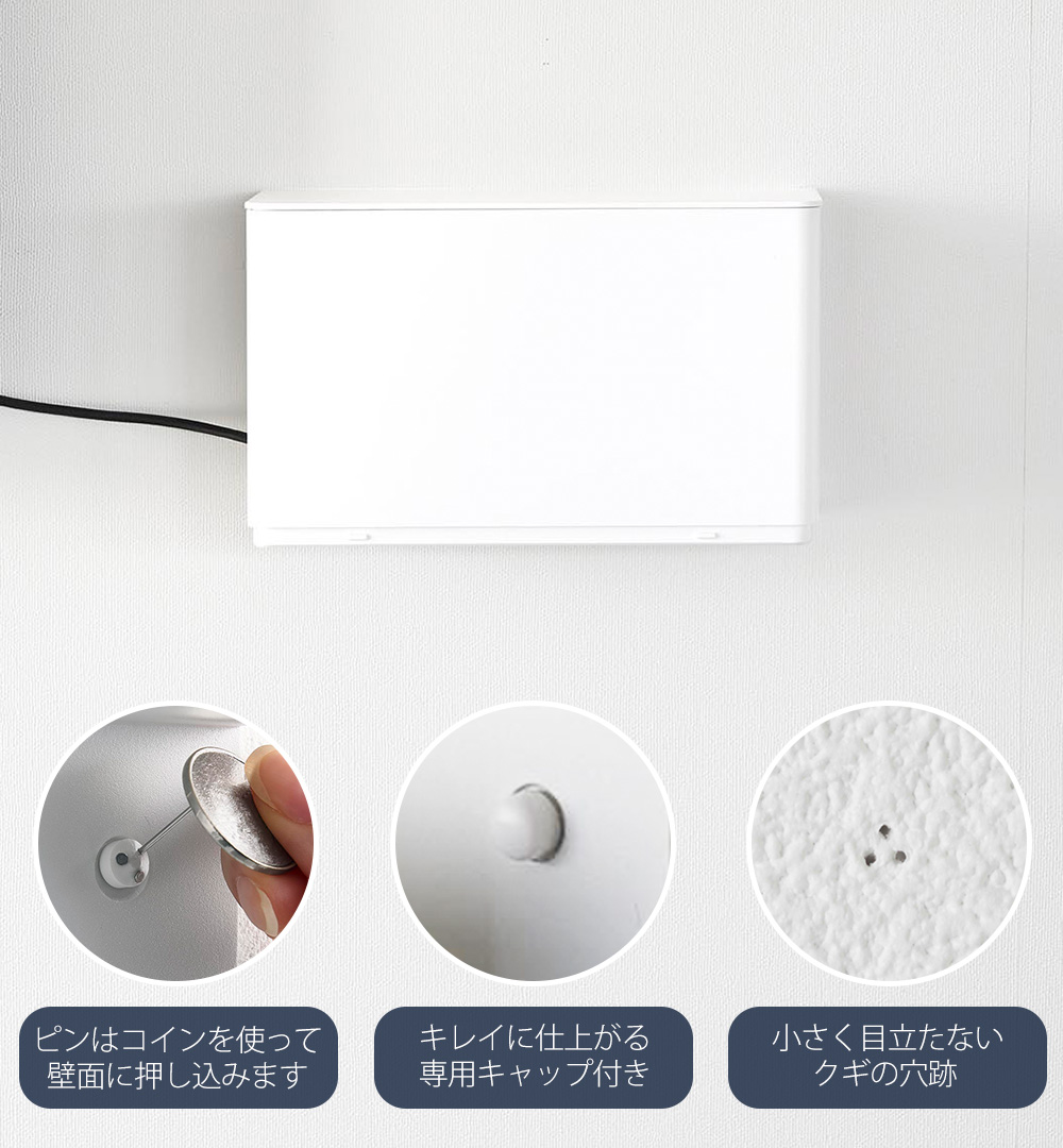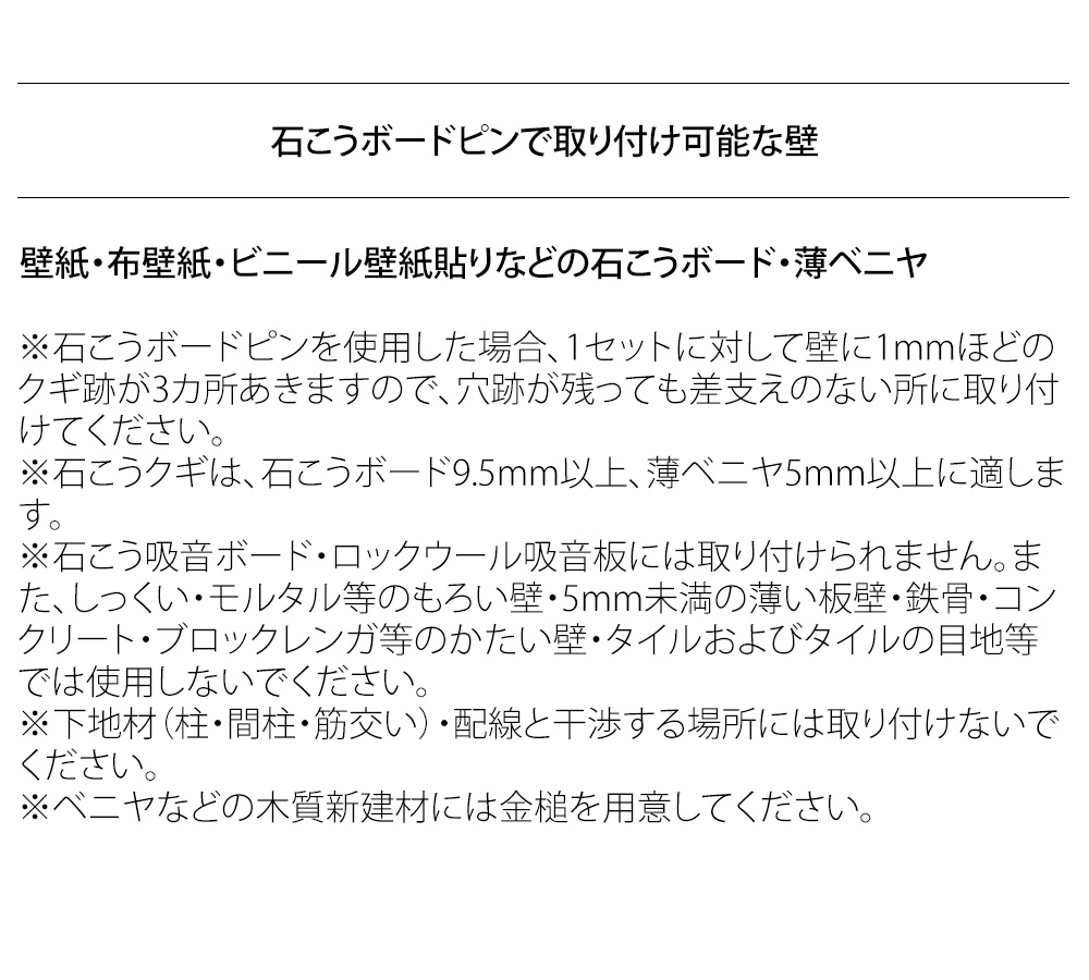 取り付ける壁面に合わせて石こうボードピンで固定してください。ピンの先端は非常に鋭利ですので、取り付け時に思わぬケガをする恐れがあります。お取り扱いにご注意ください。