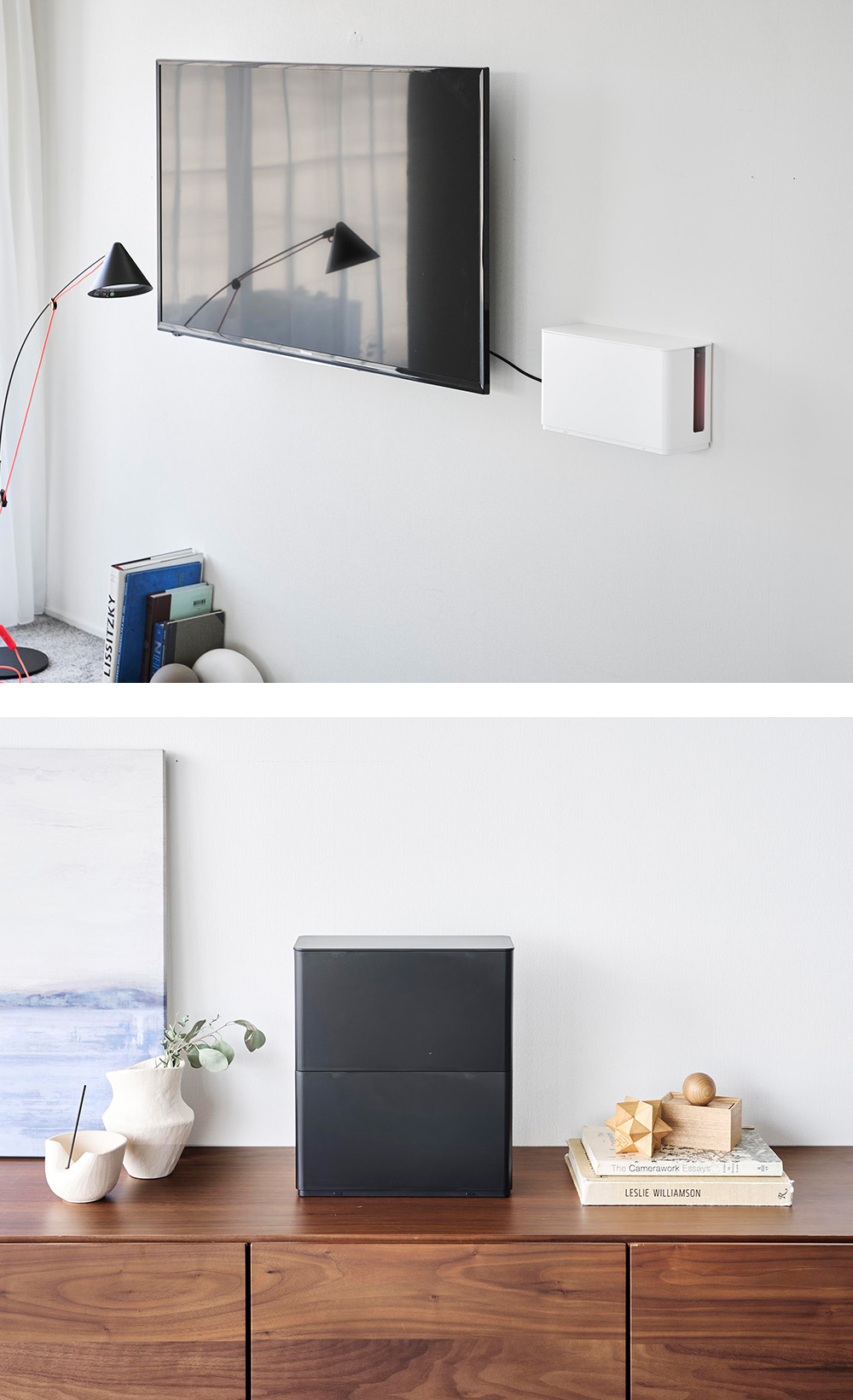 収納ケースはデスクやテーブルに置いて使うか、壁面に取り付けて浮かせて使うか、二通りの取り付け方法から選べます。