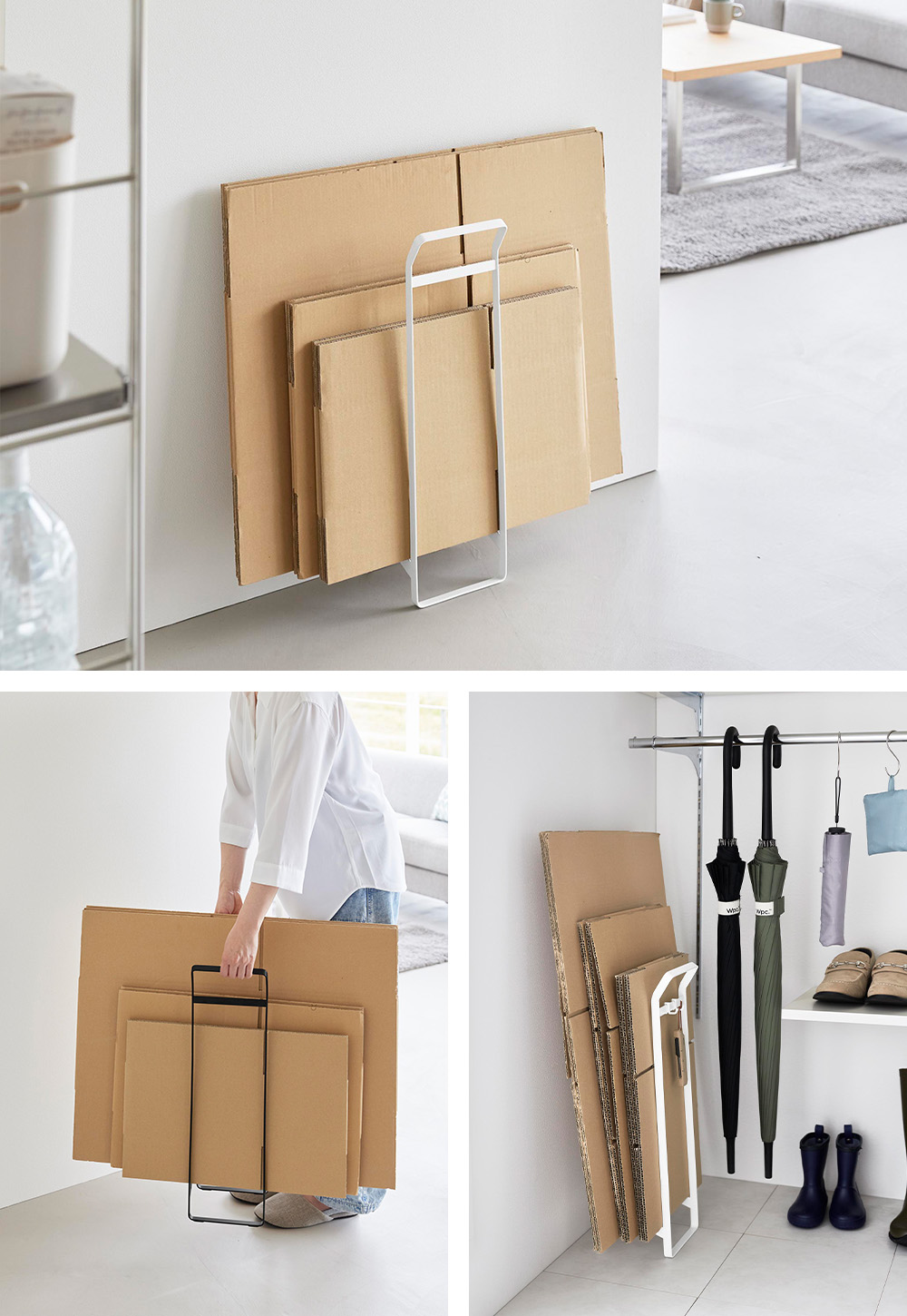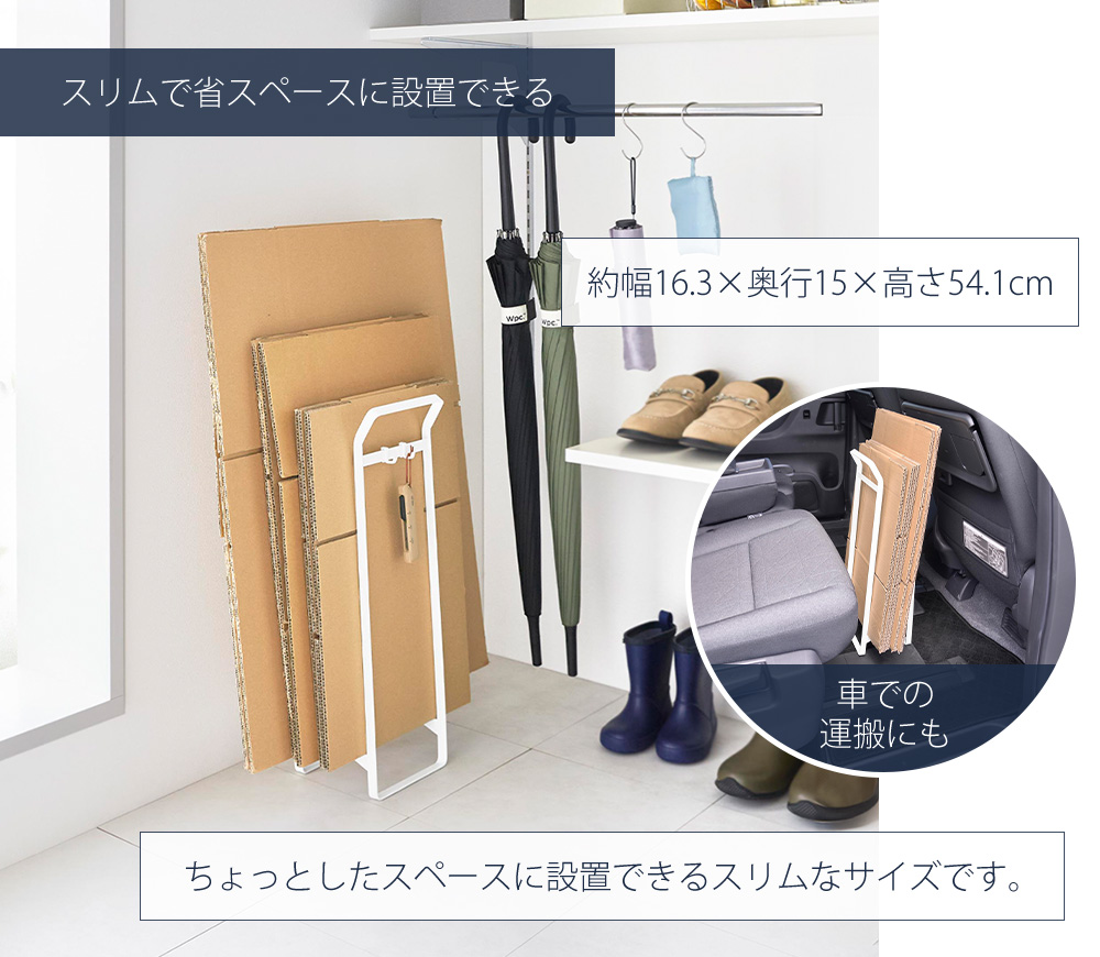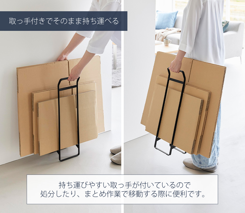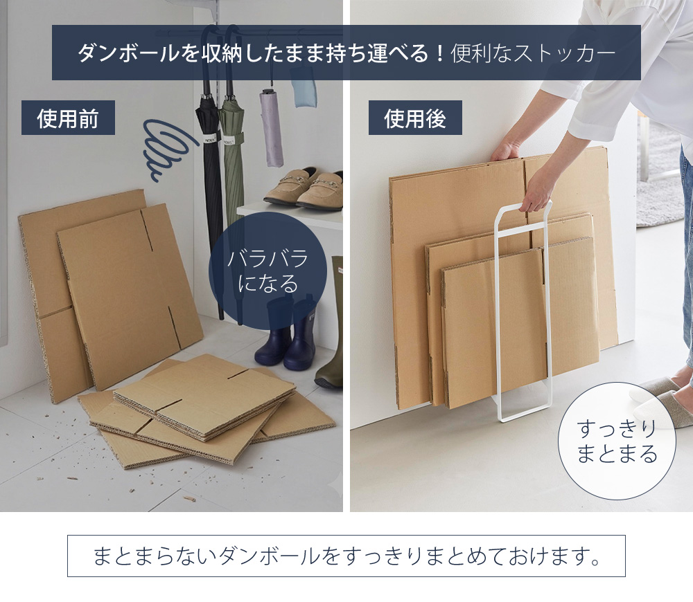 置いておくとバラバラになりがちなダンボールをすっきりまとめて、そのまま持ち運ぶことができるストッカーです。
