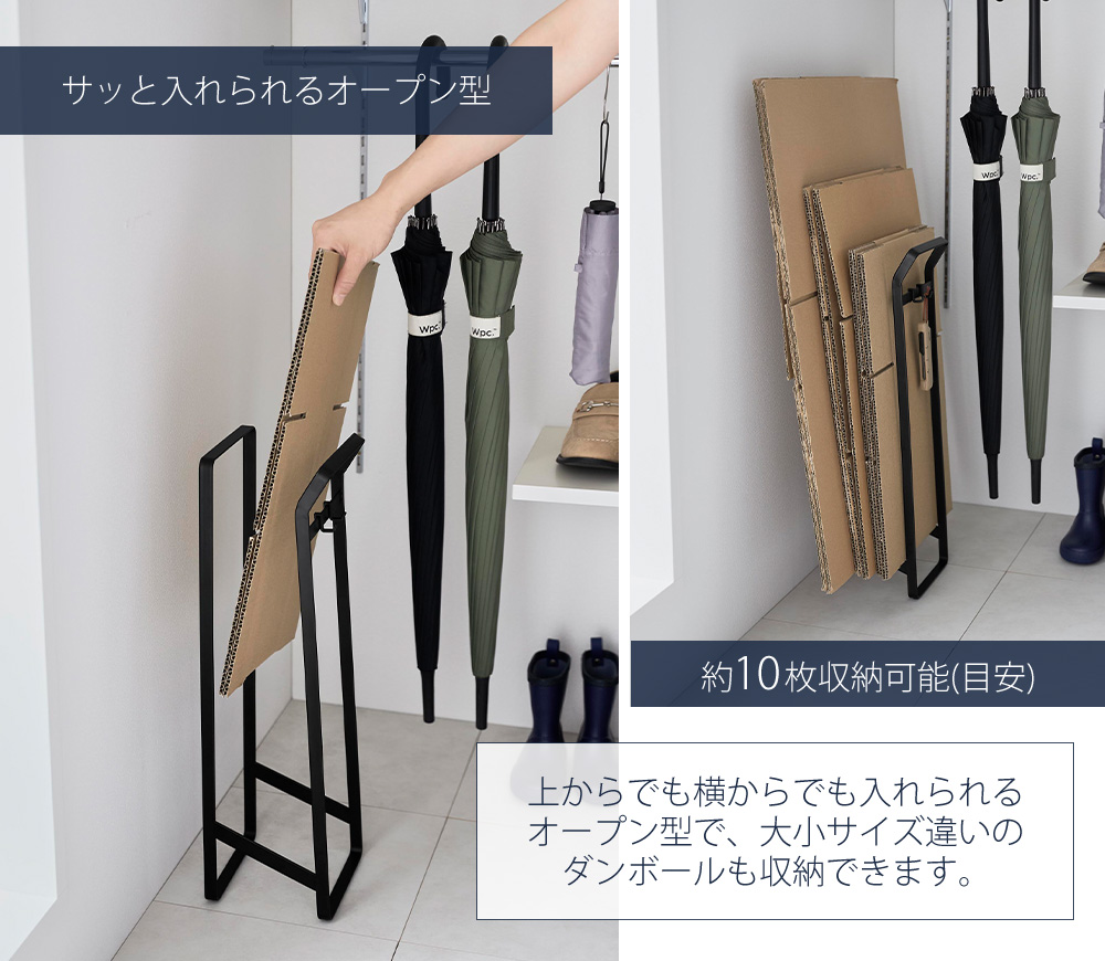 オープン型のストッカーなので、上からでも横からでもサッと入れることができます。約10枚収納可能で、大小サイズ違いのダンボールも収納できます。