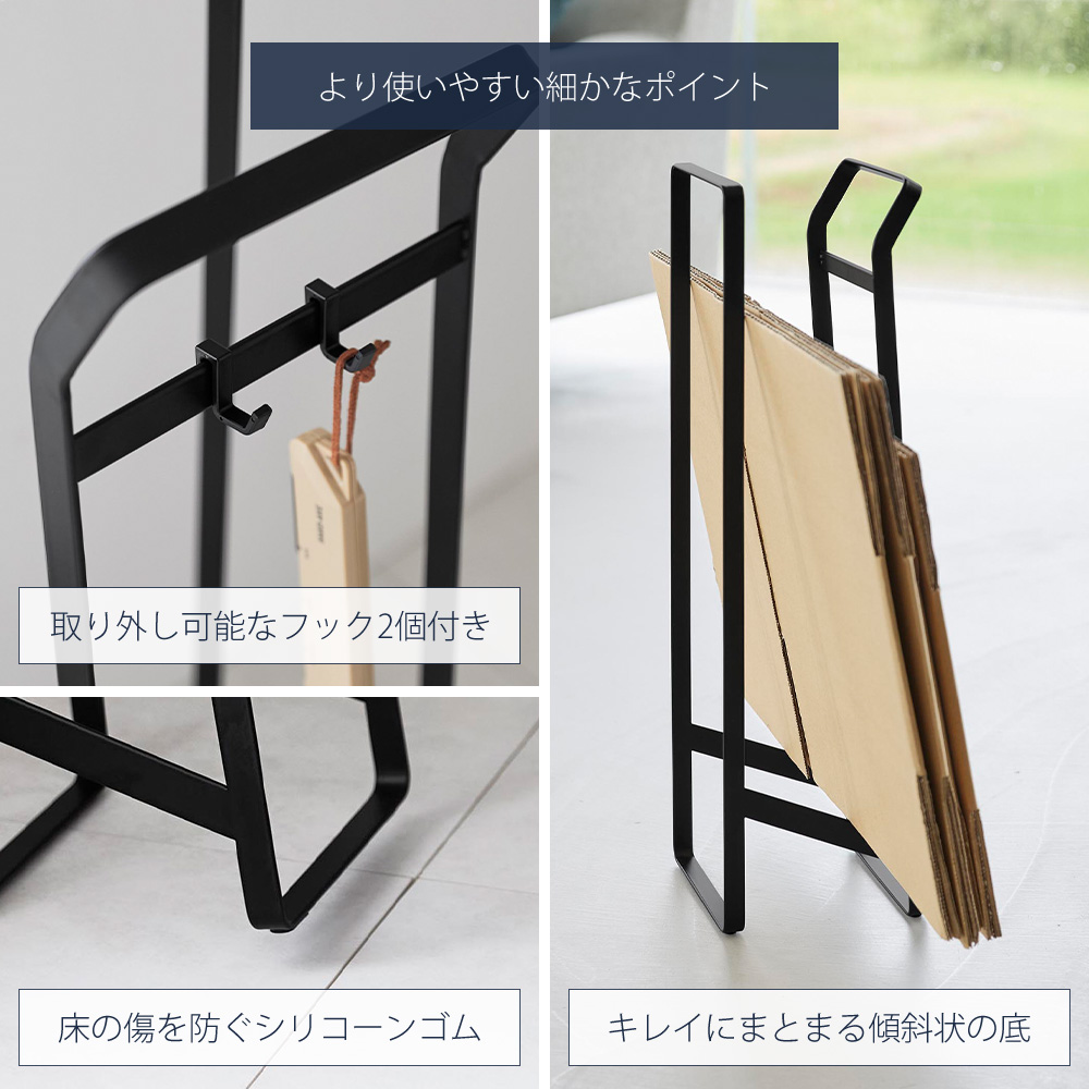 カッター等の小物を掛けて収納できる、取り外し可能なフックが2個付き、床の傷を防ぐシリコーンゴム、自然とダンボールがキレイにまとまる傾斜状の底など、快適にご使用いただけるポイントが詰まっています。
