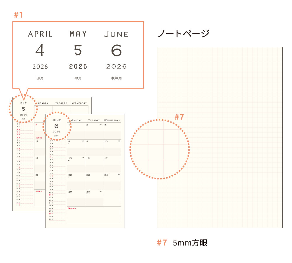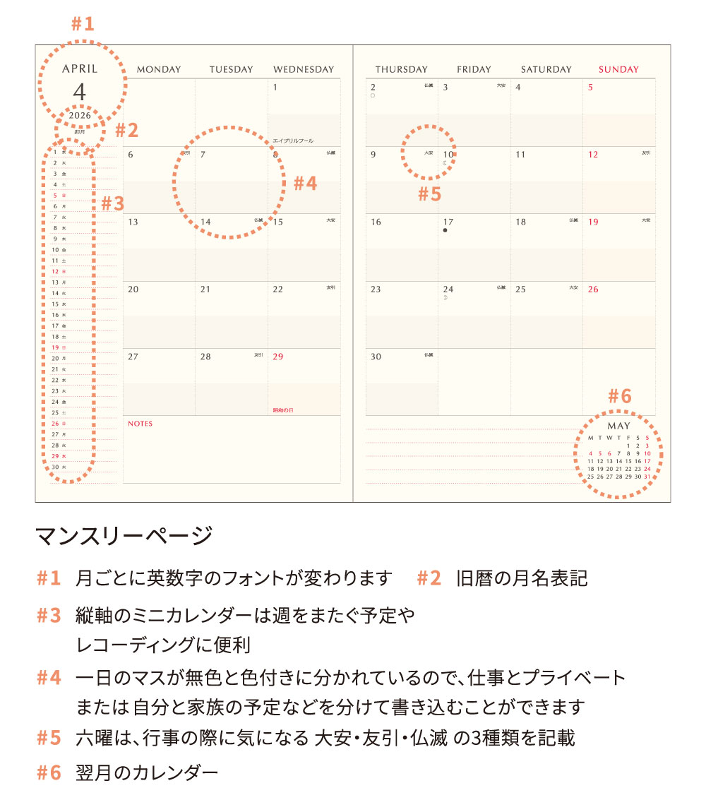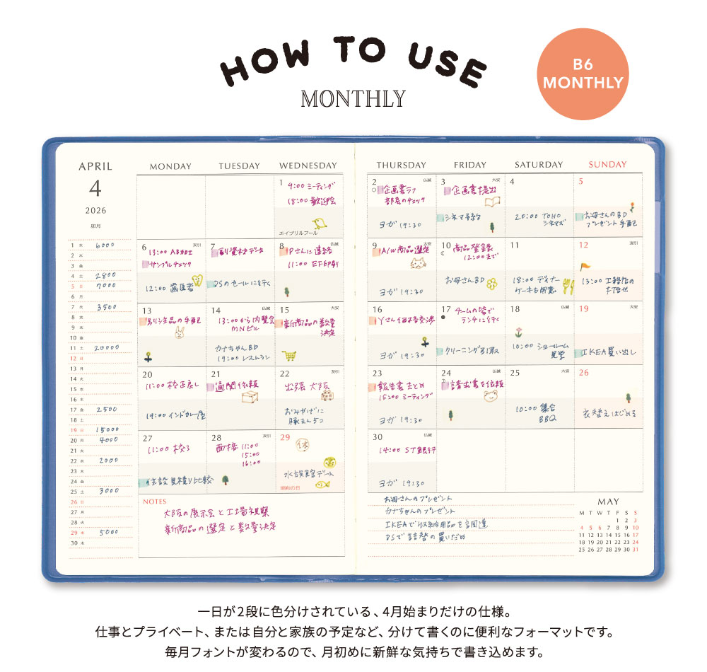 薄型のB6サイズで 携帯性にも優れ、月ごとにフォントのデザインが変化する かわいくて楽しいフォーマット。