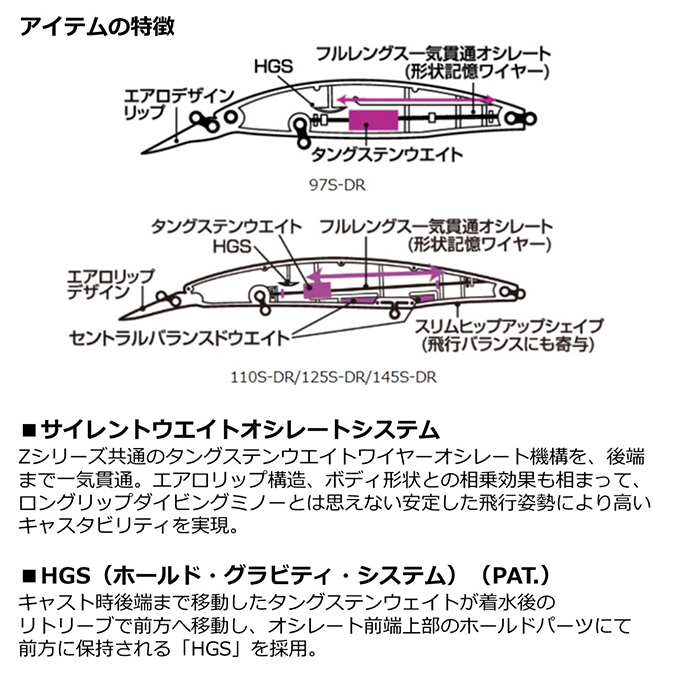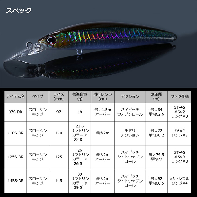 キャスタビリティ・レンジキープ性能を追求したスローシンキング設定ながら、多用するスロー〜ミディアムでのレスポンスを徹底追求。小沼の卓越した経験とフィールドテストを繰り返した末にたどり着いた、こだわりの「釣れるハイピッチタイトウォブンロールアクション」が持ち味。「タダ巻きのスローリトリーブ」でもしっかりした引き心地と強烈なフラッシング&波動を発生。また、流れの変化で自動的に生まれるイレギュラースライドアクションが食わせの間を与え、特別なロッドアクションの入力は不要。