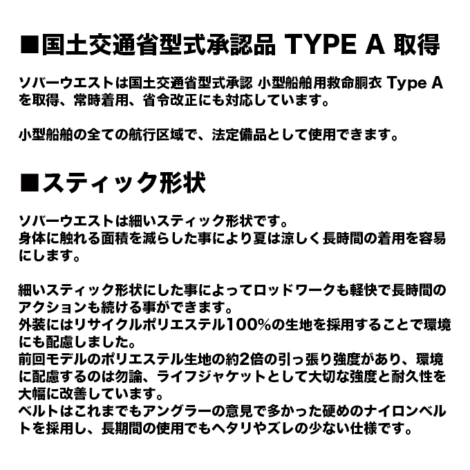 ソバーウエストは国土交通省型式承認 小型船舶用救命胴衣 Type Aを取得、常時着用、省令改正にも対応しています。
