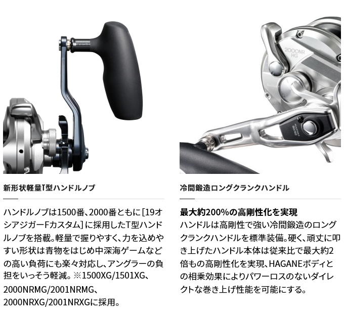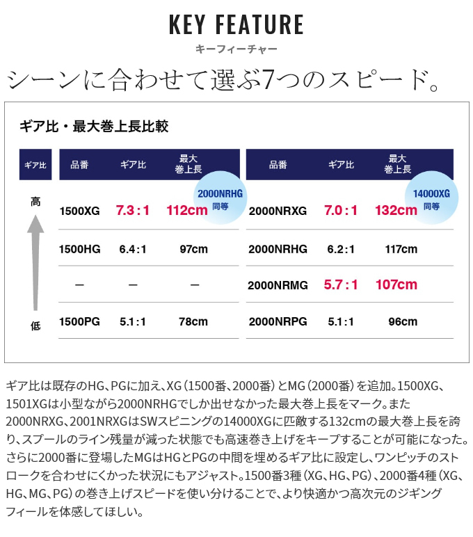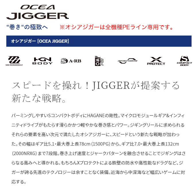 パーミングしやすいSコンパクトボディにHAGANEの剛性。マイクロモジュールギア&インフィニティドライブがもたらす滑らかかつ軽やかな巻き感とパワー。ジギングリールに求められるそれらの要素を高い次元で満たしたオシアジガーに、スピードという新たな戦略が加わった。その幅はギア比5.1・最大巻上長78cm(1500PG)から、ギア比7.0・最大巻上長132cm(2000NRXG)まで7段階。巻き上げ速度とジャークパターンを融合させることでジギングはさらなる高みへと導かれる。もちろんXプロテクトによる鉄壁の防水や高性能なドラグなど、ジガーが誇る先進のテクノロジーは余すことなく装備。近海から中深海など幅広いゲームに対応する。