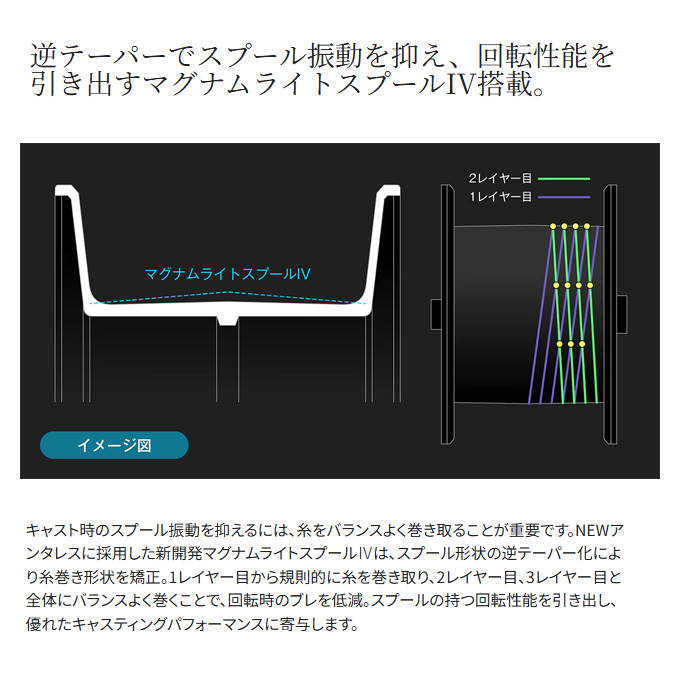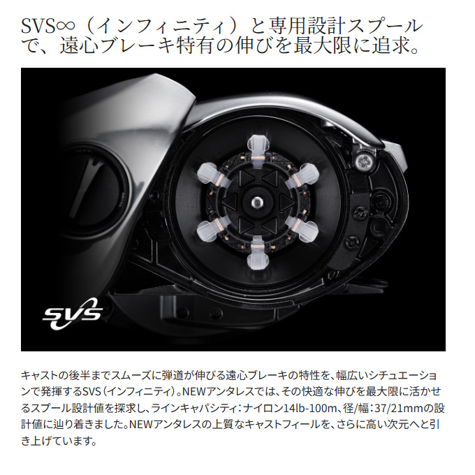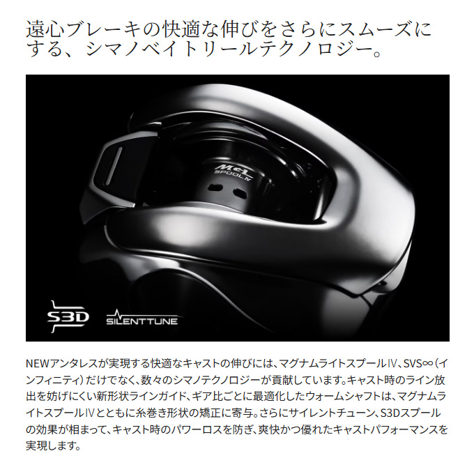キャストの後半までスムーズに弾道が伸びる遠心ブレーキ、SVS∞。NEWアンタレスでは、その特性を最大限に活かせるスプールサイズを探求し、ラインキャパシティ:ナイロン14lb-100m、径/幅:37/21mmの設計値に辿り着きました。逆テーパー形状で糸巻形状を矯正する新開発マグナムライトスプールIVの搭載と、新形状ラインガイド、ギア比ごとに最適化したウォームシャフトとの相乗効果により、規則的にバランスよくラインが巻き取られ、キャスト時のスプール振動を低減。従来から踏襲したサイレントチューン、S3Dスプールの効果が相まって、キャスト時のパワーロスを防ぎ、どこまでも伸びてゆく、胸のすくようなキャストパフォーマンスを実現します。ベイトリールで初となるサイレントドライブの搭載や、ドライブギア軸のベアリング3個支持により上質かつ快適な回転フィーリングを獲得。流麗かつ爽快なキャストパフォーマンスと、上質で快適な操作フィーリングを実現するアンタレスは、遠心ブレーキ搭載ベイトリールの新たなるフラッグシップです。