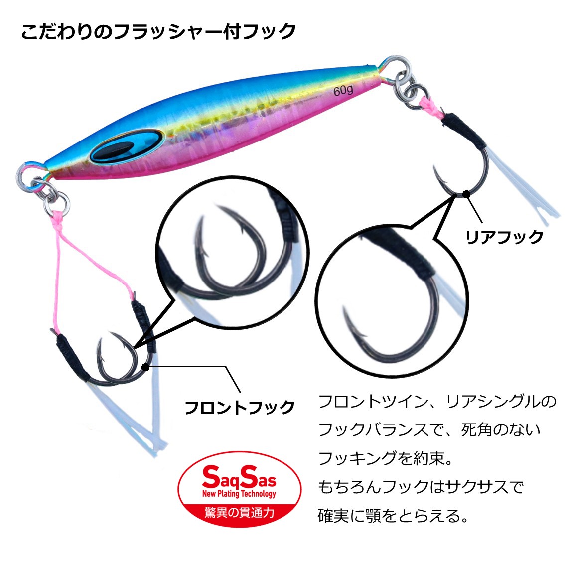 フロントツイン、リアシングルのフックバランスで、死角のないフッキングを約束。もちろんフックはサクサスで確実に顎をとらえる。
