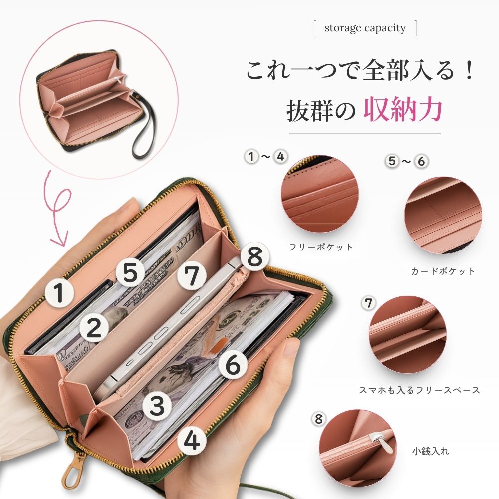 メイン収納×2、小銭用ジッパーポケット×1、カードポケット×8、フリーポケット×2と、整理しやすい構造です。