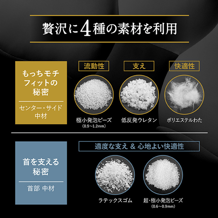 | 材質 | 【まくら本体】 伸びる部分:ナイロン90%、ポリウレタン10% 伸びない部分:ポリエステル100% 首部分:ポリエステル85%、ポリウレタン15% 詰め物(頭部):ポリスチレンビーズ、ポリウレタンフォーム、ポリエステルわた 詰め物(首部):ポリスチレンビーズ、ゴム素材 【まくらカバー】 レーヨン95%、ポリウレタン5% |