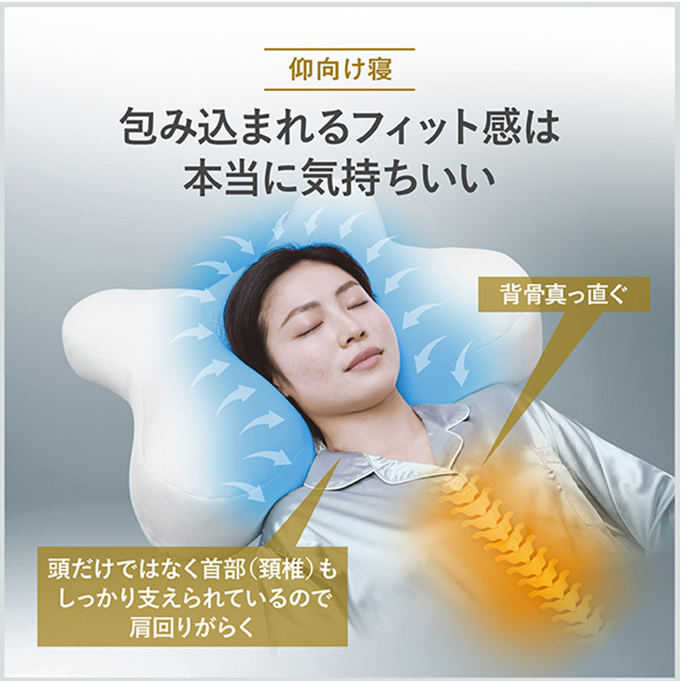 | ■仰向け寝 首がしっかり支えられ安定することで、肩が開いて呼吸もしやすくなります。 背骨も真っ直ぐ床面と並行になり、身体への負荷が軽減し理想の寝姿となります。 ![]() ■横向き寝 横向き寝の方は肩が窮屈にならないことで呼吸がしやすくなり、寝心地が良くなります。 頭の重さはボーリング玉の重さがあると言われています。 サイドにボーリング玉を置いてもしっかり高さをキープし、肩を窮屈にさせないことで、肩口に安定し寝姿勢が保たれます。 もちろん頭を置くサイドはもっちり気持ち良い! また仰向け寝派の方が寝返りの際、横向き寝になる際にも肩さがキープされ肩が窮屈になりません。 ![]() ![]() ■うつぶせ寝 枕を抱え込むことで、大胸筋を開いた状態で固定でき、呼吸が楽になります。 今話題の「うつ伏せ寝」は舌が下をむくことで鼻の通りが良くなります。スムーズな呼吸でたくさんの酸素を丁寧に取り込みます。 ![]() |