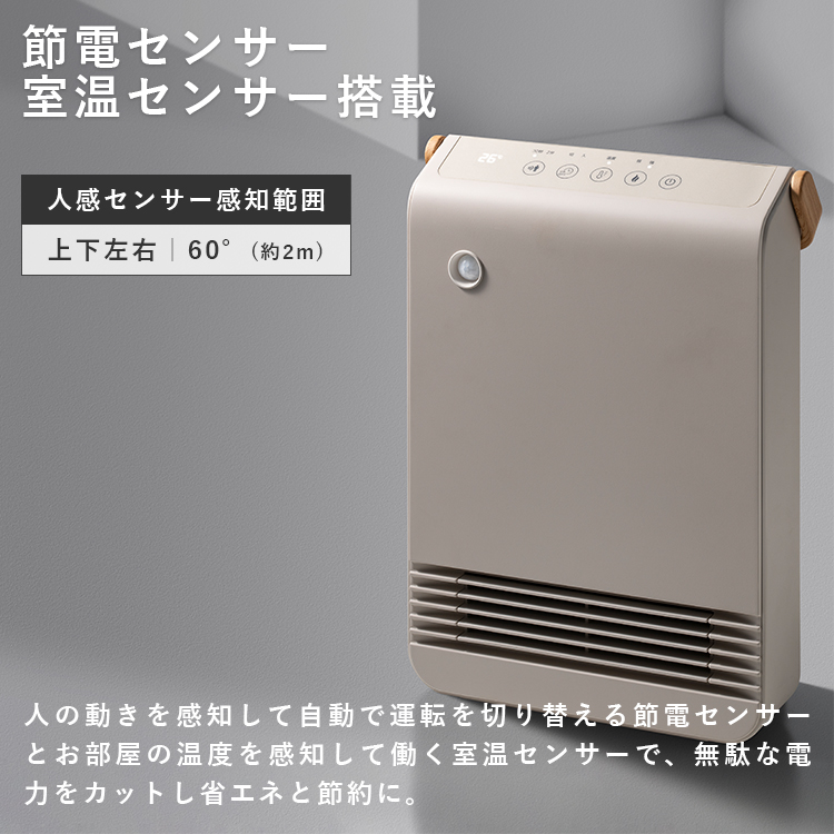 | 質感の高い木目調とモダンなボディカラーが魅力の「WOOD STYLE」シリーズから、スリム設計のセラミックヒーターが登場。 節電センサーと室温センサーを搭載し、快適さと省エネを両立します。 木目調の大型ハンドルは持ち運びしやすく、インテリアにも馴染むアクセントに。 機能美と心地よさを備えた、シンプルで洗練された一台です。 |