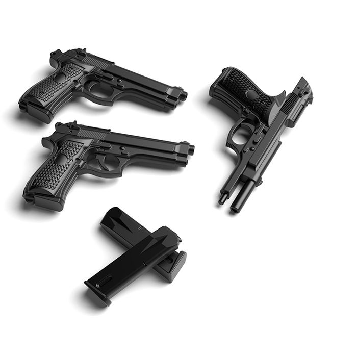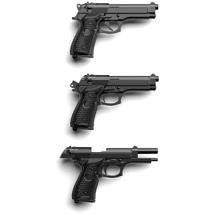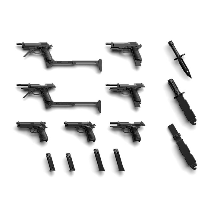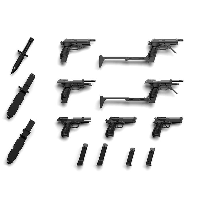 要人警護・特殊作戦用拳銃M93R。M9と同じモデル92がベースですが、こちらはロングバレル・ロングマガジンを備え、セミオートと3バーストが可能なセレクティブファイアモデルです。キットでは、M9とM93Rの様々な形状を再現。ハンマー起倒・スライド前後の3形状を再現。オプションはM9銃剣で、同時期にリリースされるM4A1タイプ2.0に装着することが可能です。