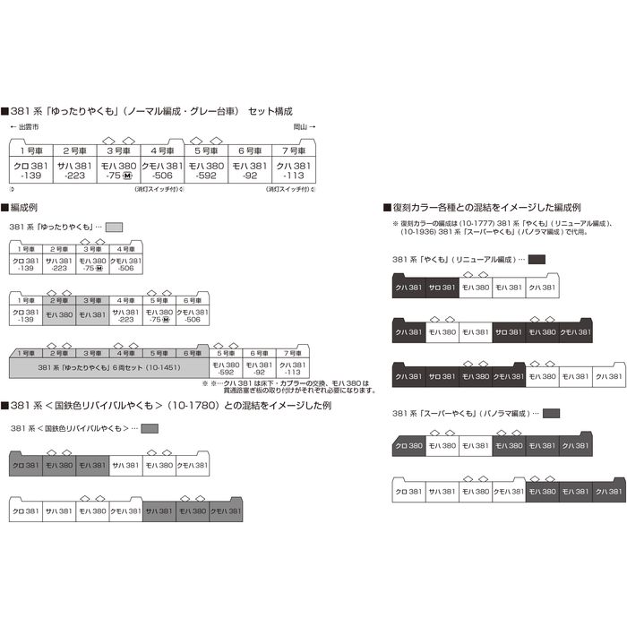 「ゆったりやくも」は岡山と島根県出雲市を結ぶ特急列車で、定期運用に就く最後の国鉄形特急電車として注目を集め、令和6年(2024)6月に新形車両273系にその役目を譲る形で定期運行を引退しました。晩年は各車両の台車がグレーになり、またクロ381-139など一部の車両は床下機器も全てグレーとなった形態で活躍しました。 ■新形の273系「やくも」と世代交代した381系「ゆったりやくも」ノーマル編成を晩年の仕様で製品化 ■晩年に見られたグレー台車のほか、クロ381-139のみ床下機器も全てグレーとなった特徴的な外観を再現 ■側面サボ受け撤去、側面非常口埋め込み、LED式側面表示、プレート化された車番を再現 ■クロ381-139の客扉Hゴムは黒色、7号車(クハ381-113)の客扉窓の縁取りは銀色で表現 ■サハ381-223は岡山寄り屋根上車端部に他の車両よりもベンチレーターが多く並んだ外観と、元喫煙室の小窓を備えた窓配置を再現 ■クハ381-113はサボ受があり、白地の方向幕、切り文字の車番など原形に近い形態を再現 ■中間連結部とクモハ381-506先頭部はフック無しのボディマウント密連形カプラーを採用 ■スロットレスモーター採用で、スムースかつ静粛な走行性を実現 ■実車同様の曲線通過時に内側への車体傾斜を再現するKATO独自の車体振り子機構を搭載 ■愛称表示は変換式トレインマーク採用。「やくも(幅広)」「やくも(幅狭)」の2種類を収録 ■行先表示シール付属。「特急やくも岡山」「特急やくも出雲市」を収録。LED側面行先表示とクハ381-113用の幕式側面行先表示を作り分け ■DCCフレンドリー