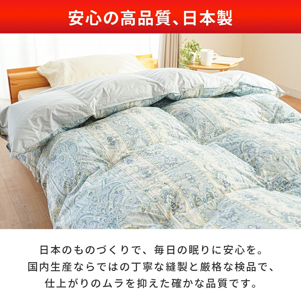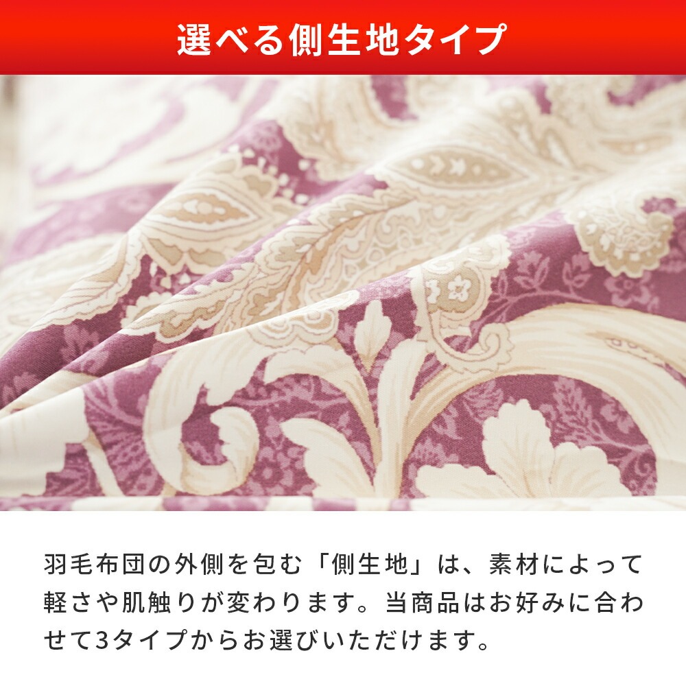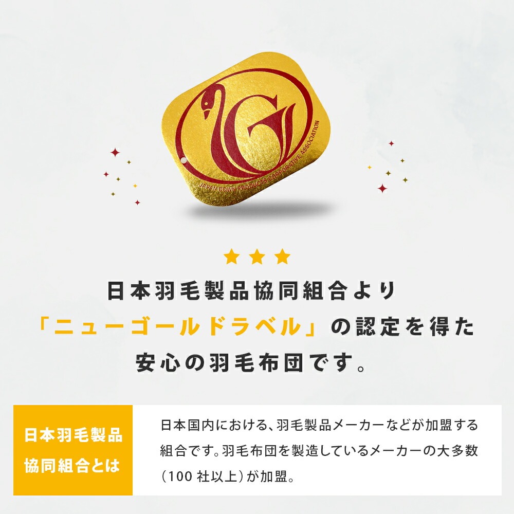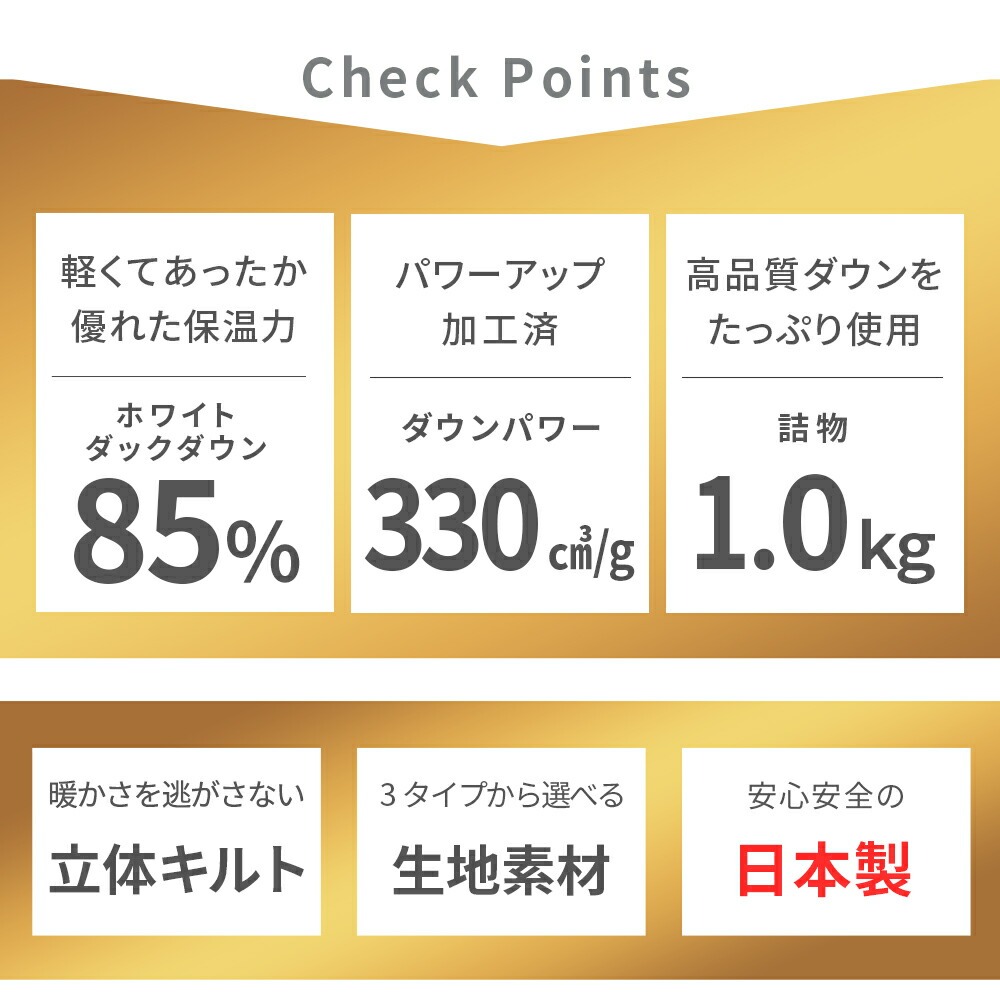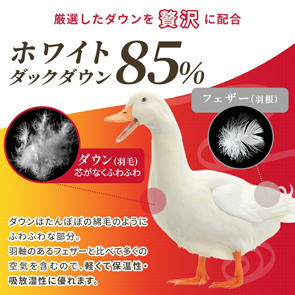 | ・厳選したホワイトダックダウンを85%使用 ダウン(羽毛)はたんぽぽの綿毛のようにふわふわな部分。羽軸のあるフェザーと比べて多くの空気を含むため、軽くて保温性・吸放湿性に優れています。 ・ダウンパワー330dp軽くて暖かく弾力性抜群。ダウンパワーは羽毛1gあたりの体積を示す数値で、膨らむ力の目安です。当商品は330dpで、暑がりさんや春秋の合間の季節にも快適に使いたい方におすすめ。 ・ニューゴールドラベル取得日本羽毛製品協同組合より「ニューゴールドラベル」の認定を取得した安心の羽毛布団です。日本国内の羽毛製品メーカーなどが加盟する組合で、羽毛布団メーカーの大多数(100社以上)が加盟しています。 ・立体キルトで暖かさを逃がさない羽毛の持つふくらむ力を存分に発揮するため、羽毛の小部屋を立体的に作ったキルトです。平面キルトに比べ縫い目部分に羽毛が偏らず保温性をキープします。 ・選べる側生地タイプ羽毛布団の外側を包む「側生地」は、素材によって軽さや肌触りが変わります。当商品はお好みに合わせて3タイプからお選びいただけます。 ・安心の高品質、日本製日本のものづくりで、毎日の眠りに安心を。国内生産ならではの丁寧な縫製と厳格な検品で、仕上がりのムラを抑えた確かな品質です。 | |