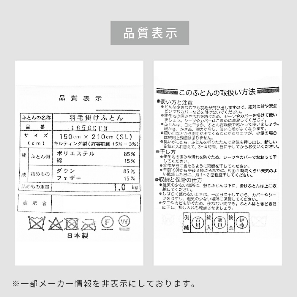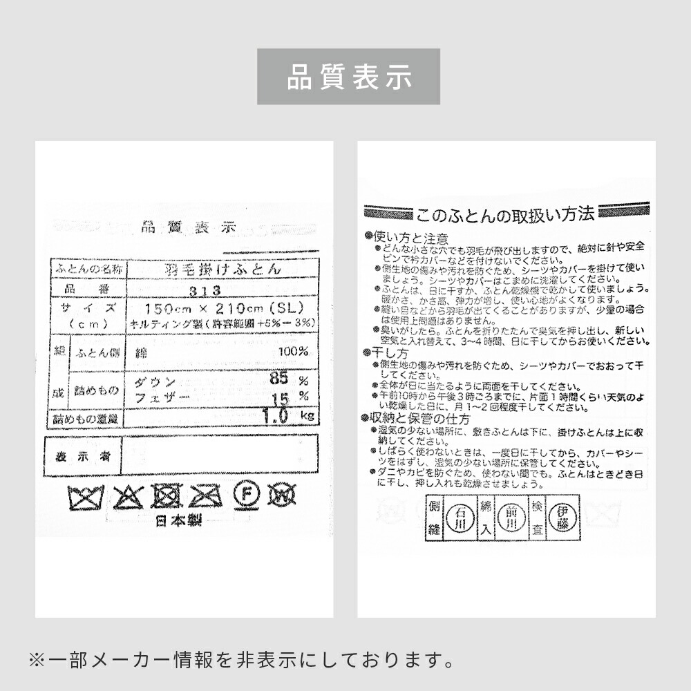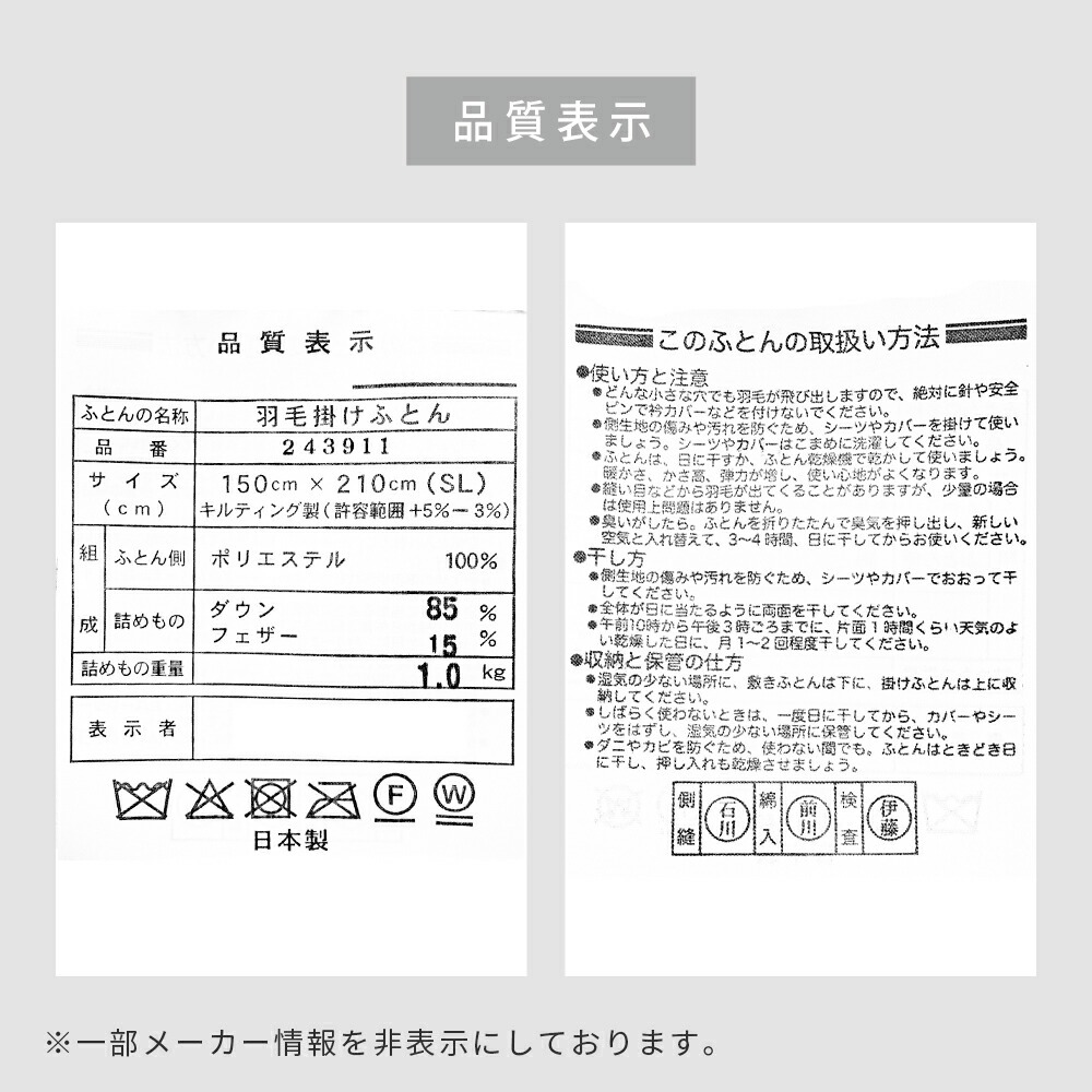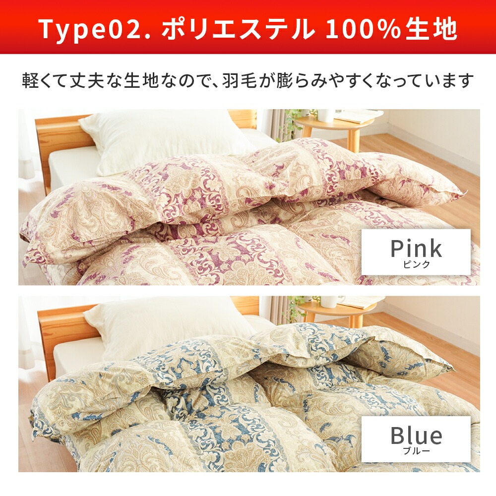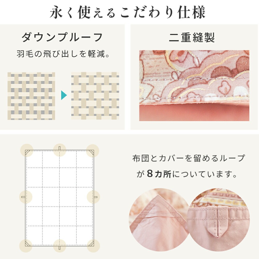 | ・厳選したホワイトダックダウンを85%使用 ダウン(羽毛)はたんぽぽの綿毛のようにふわふわな部分。羽軸のあるフェザーと比べて多くの空気を含むため、軽くて保温性・吸放湿性に優れています。 ・ダウンパワー330dp軽くて暖かく弾力性抜群。ダウンパワーは羽毛1gあたりの体積を示す数値で、膨らむ力の目安です。当商品は330dpで、暑がりさんや春秋の合間の季節にも快適に使いたい方におすすめ。 ・ニューゴールドラベル取得日本羽毛製品協同組合より「ニューゴールドラベル」の認定を取得した安心の羽毛布団です。日本国内の羽毛製品メーカーなどが加盟する組合で、羽毛布団メーカーの大多数(100社以上)が加盟しています。 ・立体キルトで暖かさを逃がさない羽毛の持つふくらむ力を存分に発揮するため、羽毛の小部屋を立体的に作ったキルトです。平面キルトに比べ縫い目部分に羽毛が偏らず保温性をキープします。 ・選べる側生地タイプ羽毛布団の外側を包む「側生地」は、素材によって軽さや肌触りが変わります。当商品はお好みに合わせて3タイプからお選びいただけます。 ・安心の高品質、日本製日本のものづくりで、毎日の眠りに安心を。国内生産ならではの丁寧な縫製と厳格な検品で、仕上がりのムラを抑えた確かな品質です。 | |