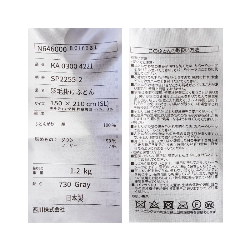 | ・独自の厳しい品質基準 お客様は羽毛布団の中身を見ることができません。だからこそ、西川はどこまでも厳しい姿勢で羽毛布団づくりに向き合います。確かな品質の商品をお客様にお届けするために、 様々な検査を重ね、一枚一枚丁寧に仕上げています。 ・西川ダウンしっかり綺麗に磨かれた、西川自慢の上質なダウンをたっぷり1.2kg詰め込みました。ふんわり軽い羽毛は、たったの0.1kg違うだけで、ボリュームに差がでてきます。価格に妥協することなく、お客様に自信をもってオススメできる羽毛布団を作りたい。 そんな私たちの想いも詰まっています。 ・羽毛トレーサビリティ認定このラベルが付いている製品は、産地偽装がない安心の羽毛を使用した製品であることを証明します。 ・フランス産ダックダウンフランスはご存知美食の国。フォアグラを食す習慣のある彼らのダックは他国に比較しても育成期間が長いのが特徴です。成熟した水鳥の羽毛はとくに大きく、その暖かさにも深みがあります。グースよりも体が小さく、食事も雑食性が強いため飼育がしやすく、比較的お求めやすい価格で流通しています。繊維そのものにハリ・コシが強くダックダウンのお布団は空気をうまくふくらませると嵩高のしっかり出たお布団になりやすいのが特徴です。お客様用にもおすすめです。 ・衿元フィットキルト冷えやすい肩口に優しくフィットする、衿元フィットキルト仕様。羽毛が片寄りやすい衿元、足元部分のキルティングを細かくしたこだわりの立体キルト。衿元・足元のキルト内での右往の動きを少なくし、へたりを軽減します。 | |