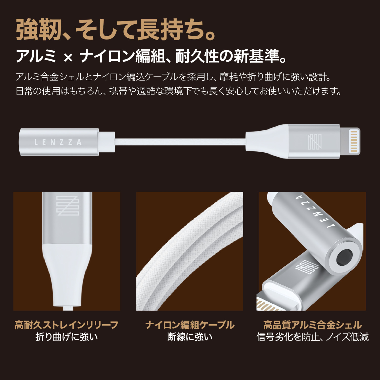 ・アルミ合金シェルとナイロン編込ケーブルを採用し、摩耗や折り曲げに強い設計。