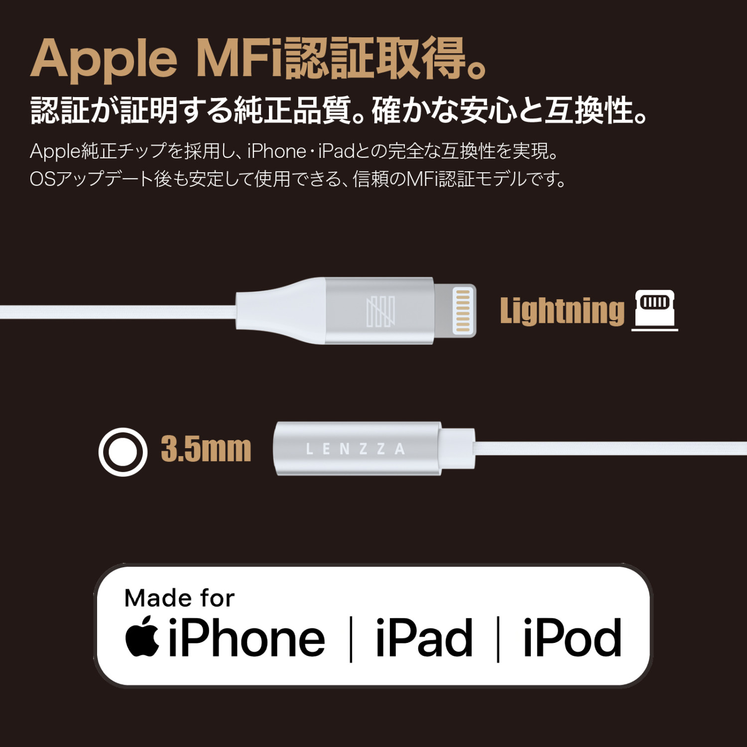 ・AppleMFi認証純正チップを採用し、iPhone・iPadとの完全な互換性を実現。