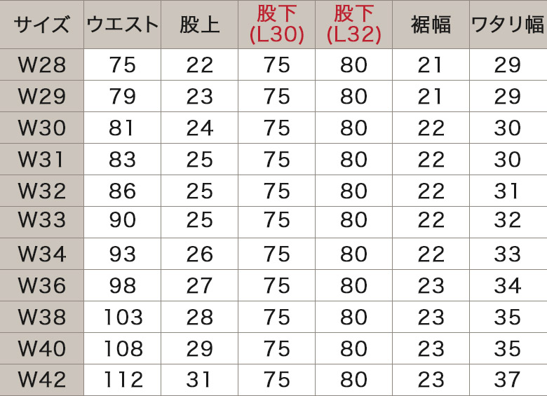 W28L32(ウエスト:75cm、股上:22cm、股下:80cm、裾幅:21cm、ワタリ幅:29cm)